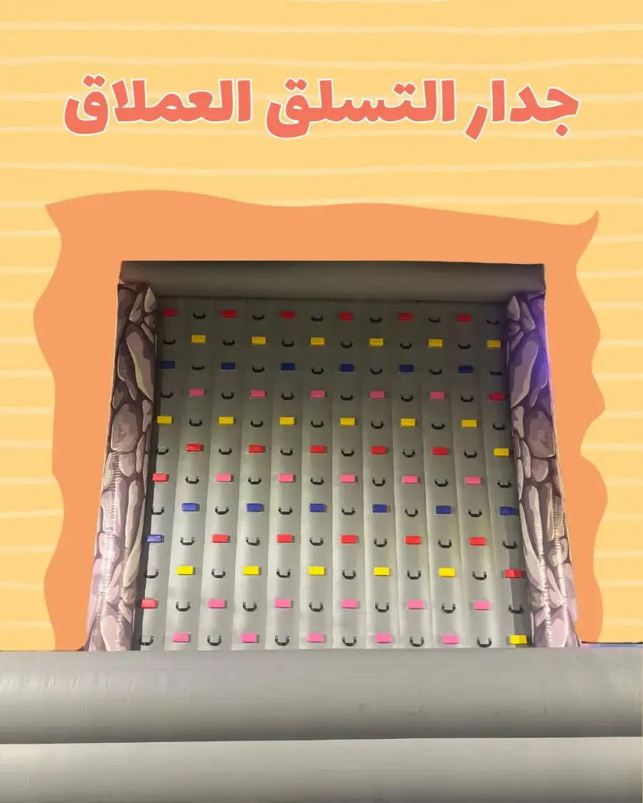 TThe Giant Climbing Wall is a fun and safe inflatable game designed for both children and adults. It helps develop physical fitness, endurance, and balance in an entertaining way. It is perfect for events, festivals, school parties, and family occasions. š General and Technical Specifications: Type: Inflatable game with climbing wall design Materials: High-quality, puncture-resistant PVC Colors: Multicolor (Yellow, Red, Blue, Pink) Approximate Height: 5 to 7 meters Approximate Length and Width: 6Ć4 meters (customizable based on the model) Safety Features: Padded wall, inflatable base, secure hand and foot grips Operated by: Continuous electric blower Free delivery and installation with in Jeddah City- Obhur Makkah ā Thuwal ā Khulais