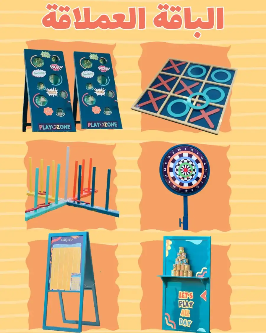 A complete bundle featuring a variety of oversized games such as Tic-Tac-Toe, ring toss, and other skill-based challenges. Provides a full entertainment experience full of fun and competition. Perfect for large events, schools, entertainment centers, and festivals Games included in the pack: Multi-hole Dice Table Game Tic Tac Toe Game Colored Ring Toss Dartboard Target Throwing Letters and Words Game (Educational and Fun Board) Stacking Can Toss Game Technical Specifications: Made from durable and safe materials Easy to use and set up Suitable for indoor and outdoor use Enhances group interaction, thinking skills, and focus Suitable for all age groups Free delivery and installation with in Jeddah City- Obhur Makkah – Thuwal – Khulais