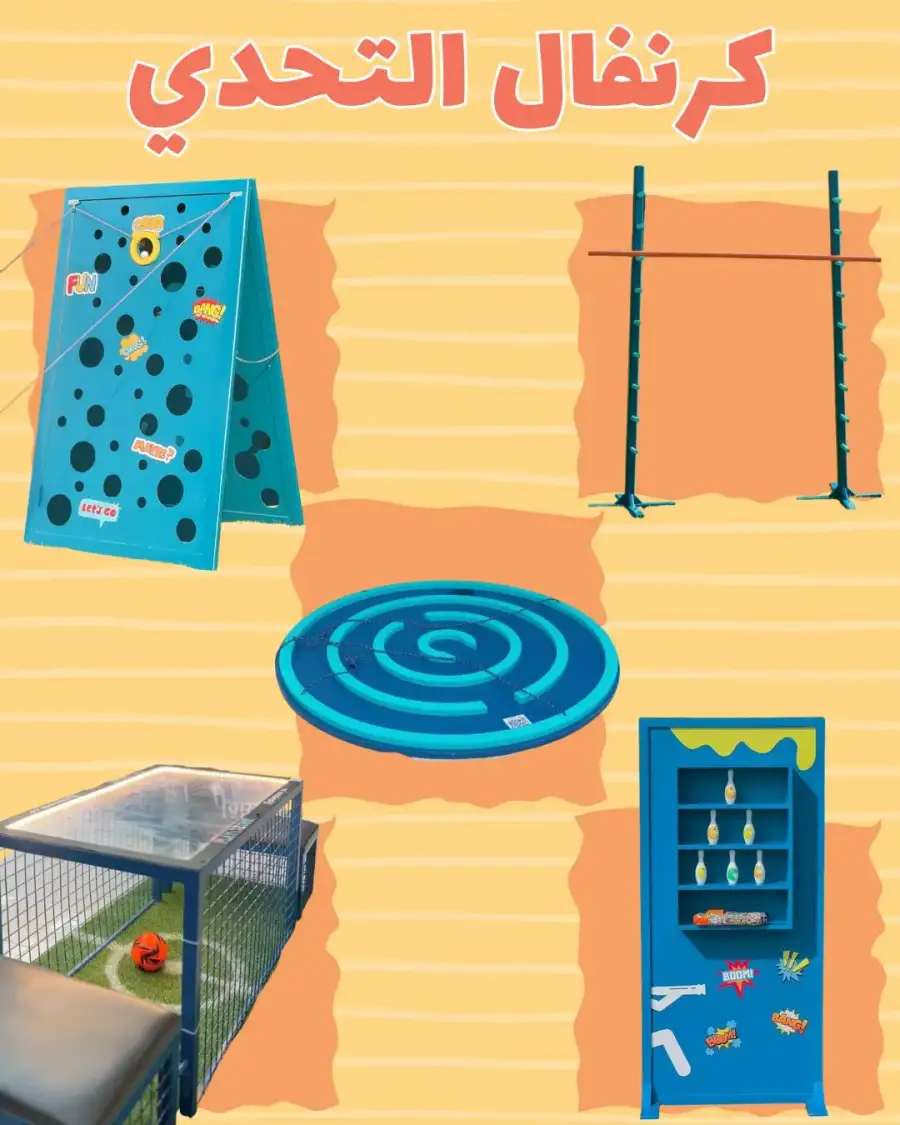 A carnival-style attraction offering a variety of challenge games such as climbing, balancing, and throwing. It creates an exciting and competitive atmosphere, making it ideal for sports events, festivals, and large exhibitions. 🎯 Included Games: Ball Maze Balance Game Enclosed Goal Shooting Game Rope Precision Maze Challenge (Black Maze) Limbo Game (Cross the Bar) Shooting Game with Bowling Pins Technical Specifications: Specification Details Number of Games 5 Material Painted wood + safety metal mesh Usage Suitable for both indoor and outdoor use Age Group 6 years and above Setup Time 10 to 15 minutes Portability Easy to assemble, disassemble, and transport ✅ Key Features: Colorful, fun, and safe design Enhances focus, coordination, and balance Great for individuals or team-based competitions Engaging for both kids and adults Ideal for schools, carnivals, and family gatherings Free delivery and installation with in Jeddah City- Obhur Makkah – Thuwal – Khulais