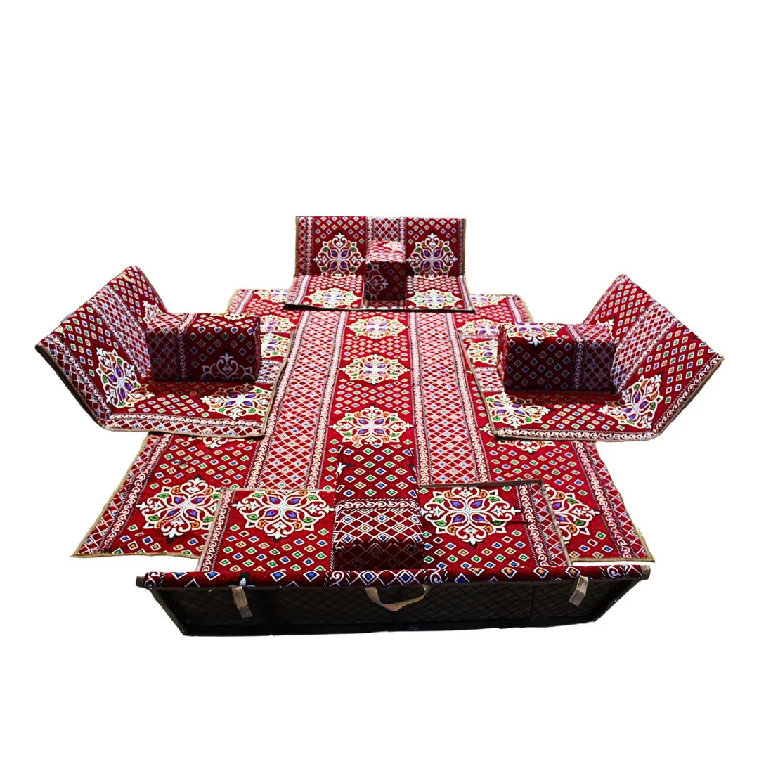 Elegant traditional Arabic floor seating with a supportive backrest, perfect for adding cultural charm and comfort to any event. Designed with authentic patterns and fabrics, this setup is ideal for majlis gatherings, cultural events, outdoor lounges, and private occasions. Features: Authentic Arabic-style design Comfortable backrest for added support High-quality materials (thick fabric + inner foam) Available in multiple colors and patterns Suitable for indoor and outdoor use Rentable as individual pieces or full seating sets Perfect For: Arabic majlis setups and cultural events Ramadan tents and lounges Weddings and guest seating Exhibitions and traditional festivals