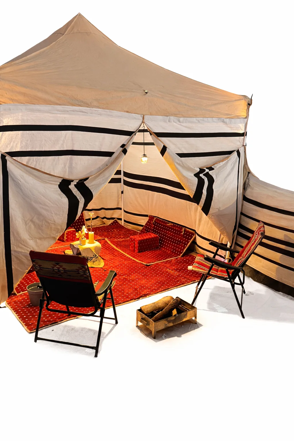 A tent with floor seating or chairs, with lighting and interior accessories.