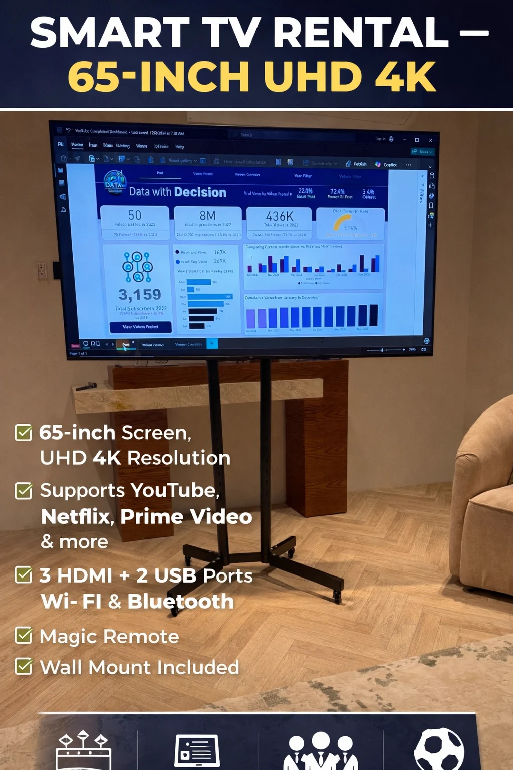 Smart TV Rental – 65-inch 4K UHD We offer 65-inch Smart TV rental with 4K UHD resolution, ideal for events, meetings, presentations, sports viewing, and exhibitions. TV Specifications • Screen Size: 65 inches • Resolution: UHD 4K (3840 × 2160) • Operating System: WebOS • Supported Apps: YouTube – Netflix – Prime Video – Shahid • Connectivity: Wi-Fi & Bluetooth • Ports: 3 HDMI + 2 USB • HDR technology for enhanced picture quality • Refresh Rate: 60Hz • Response Time: 8 ms • Magic Smart Remote Features ✔ Crystal-clear 4K picture quality ✔ Ideal for presentations and business meetings ✔ Supports computers, PlayStation, and streaming devices ✔ Built-in apps – no additional devices required ✔ Easy setup and operation Rental Includes • TV screen • Remote control • Wall mount bracket Suitable For • Events and exhibitions • Meetings and presentations • Private events and gatherings • Watching sports and live matches