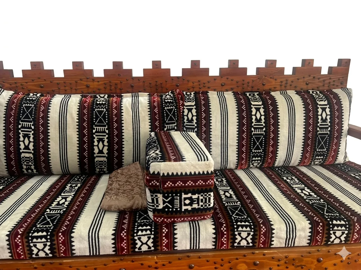 The Elevated Traditional Wooden Majlis offers a heritage-inspired seating arrangement, elevated from the ground to ensure durability and stability. Crafted from robust wood, it's designed for comfort and practicality, typically adorned with carpets or mats and complemented by floor cushions ( مساند ) for extended seating. Its design emphasizes simplicity rooted in local tradition, highlighting traditional carpentry details like hand-carved embellishments or subtle engravings. Suitable for rest areas or outdoor spaces, the Majlis offers protection from moisture and dust, while providing enhanced ventilation, particularly in warmer climates. Ideal for welcoming guests or family gatherings, it embodies authenticity and functionality, reflecting the spirit of generosity and hospitality inherent in Saudi culture.