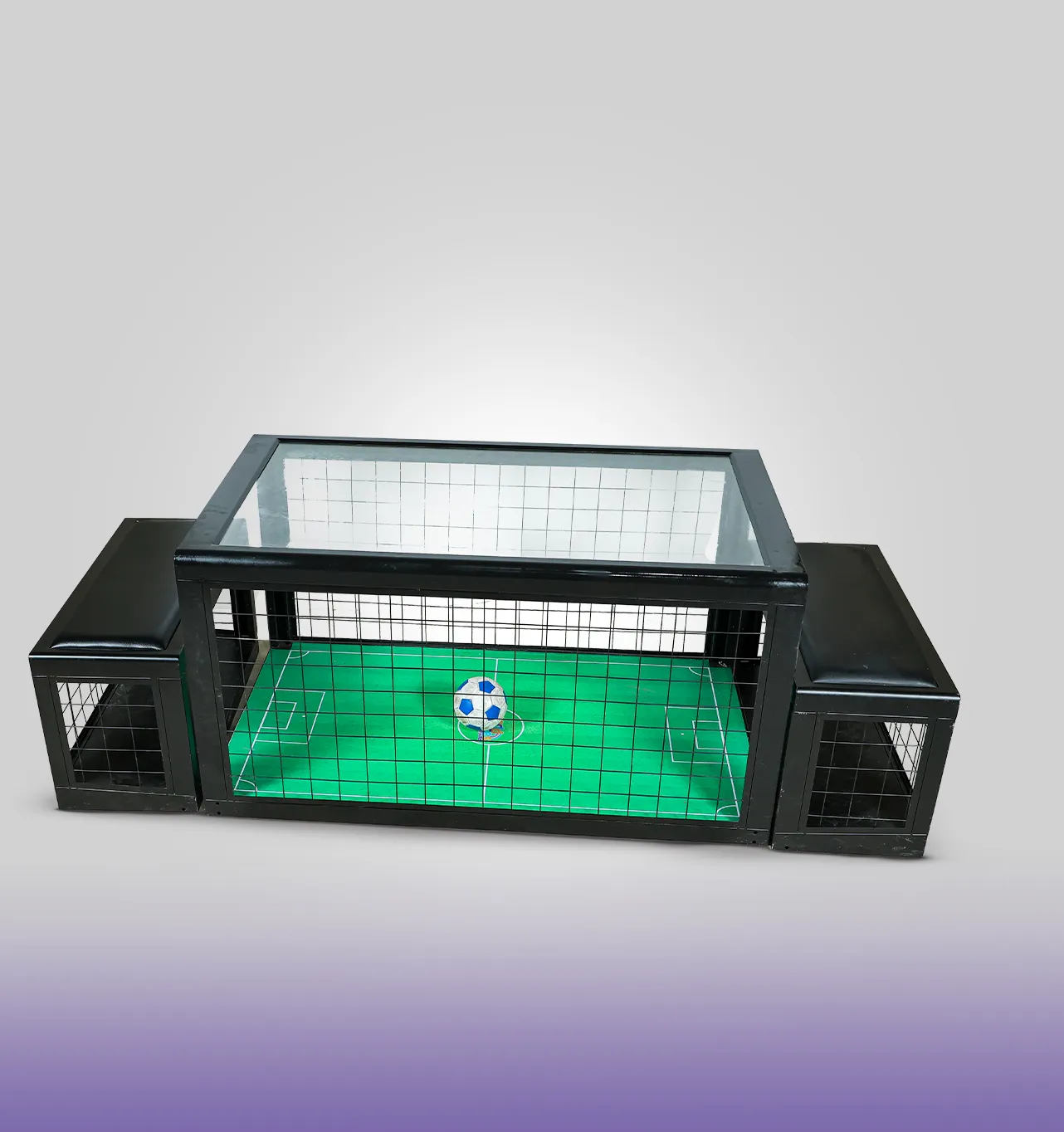 A classic game that lets you challenge your friends to a realistic table football match. An innovative piece of furniture that combines practicality with entertainment, ideal for living rooms, children's playrooms, or as a stylish decorative piece for sports enthusiasts. - Football Field Design - A rectangular table with a sturdy black metal frame, featuring a unique design that incorporates a miniature "football field" inside. - A transparent tempered glass top allows for a clear view of the field's details while providing a practical surface for everyday use. - The sides are encased in black metal mesh, giving it a sporty look reminiscent of an actual football field. - A green surface mimics the grass of a football pitch, complete with a full field layout (penalty area, center circle, and touchlines). - A small football sits in the center of the field, adding a touch of visual interest and vibrancy to the design. - The table comes with two matching side stools (poufs) in the same design and materials. The stools are upholstered in comfortable black leather, and their hollow bases are encased in the same metal mesh, allowing for space-saving storage under or beside the table. - A decorative centerpiece: perfect for living rooms or youth rooms. - Play area: For children and teenagers to simulate football matches. - Ideal gift: For football fans and those looking for unique furniture. Dimensions: L 2.12m x W 0.8m x H 0.8m Free delivery within Riyadh