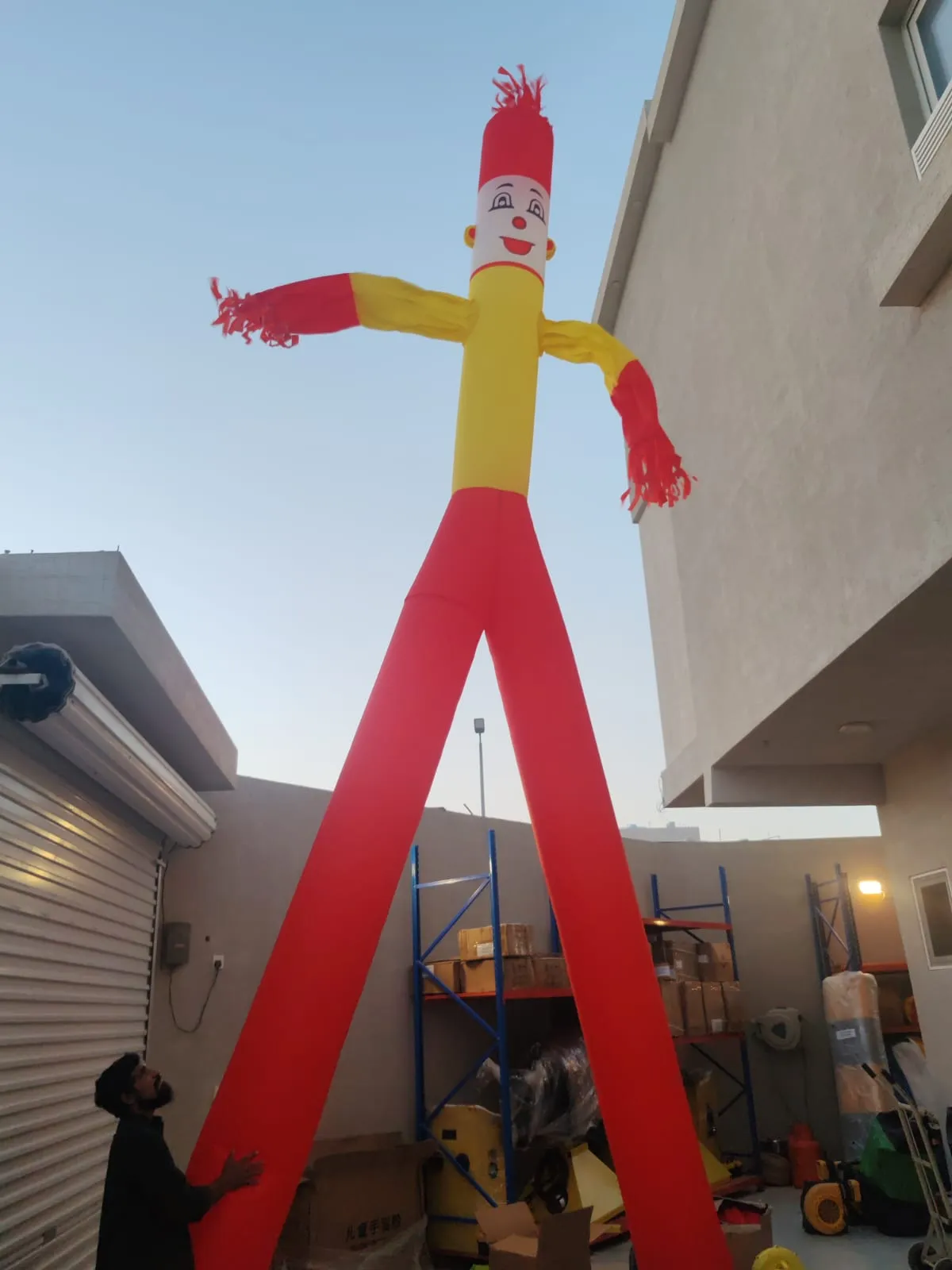 Inflatable Dancing Figure for attention-grabbing, 7 meters tall. Ideal for outdoor advertising and openings. Booking Terms The customer must ensure that the site space is suitable for the size of the requested games. Games will not be installed on sand or uneven surfaces, and installation on upper floors is strictly prohibited. Supervision of children is the sole responsibility of the customer, and there must be adults present to supervise throughout the usage period. A 220V power source must be available at the installation site. Games must not be moved after installation except by the installation team. A refundable deposit of 200 SAR per game will be charged and returned upon receiving the game in good condition. Installation and dismantling may take place anytime from dawn until Maghrib prayer, and the duration may vary depending on the type of game and location. Any additional fees imposed by event venues or rest areas are fully borne by the customer.