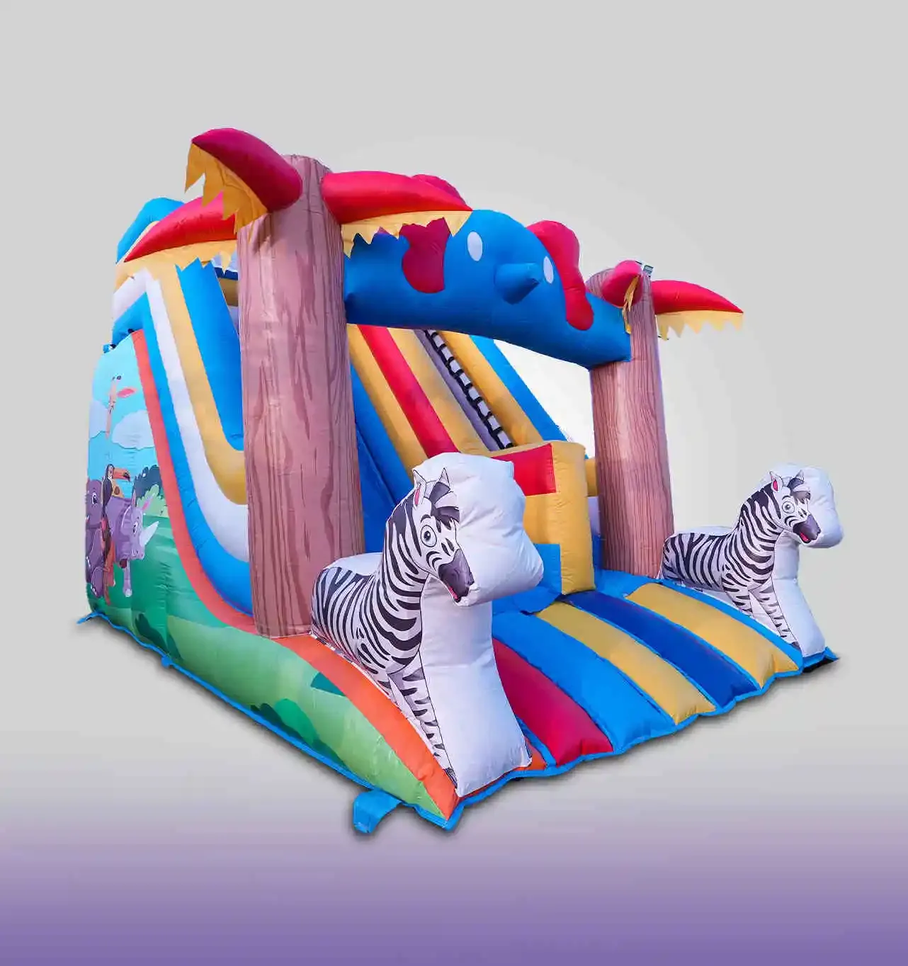 "The Jungle Slide – Smaller offers children a fun and exciting experience with enjoyable slides in a jungle-themed environment." Dimensions: L 6m × W 3.7m × H 5m