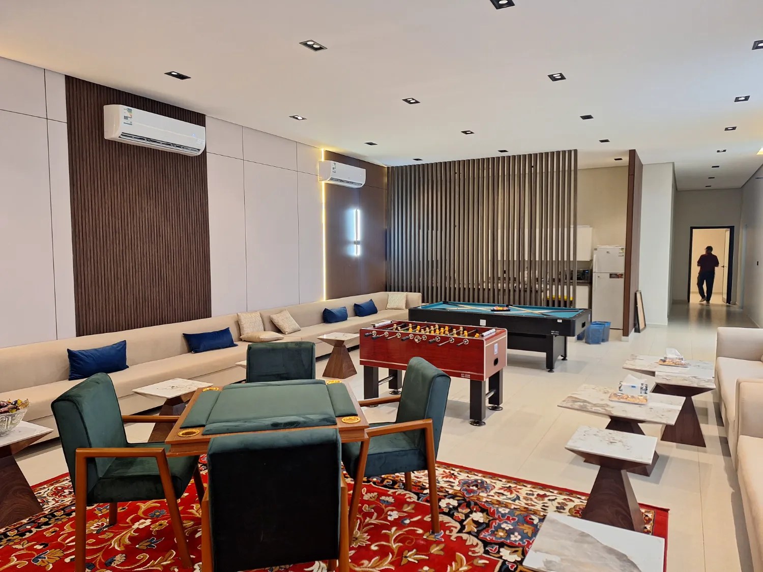 Enjoy an unparalleled baloot game experience with this luxurious table, designed to provide both comfort and elegance. The padded surface, in a deep green, gives players a comfortable feel, while the wooden armrests add a touch of sophistication. The table and chairs are made from the finest natural wood, with soft velvet upholstery that gives them a distinguished and classy look. Available for Daily Rental This table is perfect for a special game night or any event. We offer flexible rental periods to suit your needs. Free Delivery Service We provide free delivery within Dammam and Khobar, ensuring the table reaches you with ease and convenience.