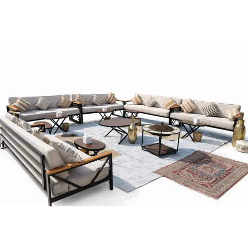 A luxury outdoor sofa seating set designed to deliver a refined and comfortable seating experience, ideal for events, receptions, private gatherings, and formal occasions. The set features a modern, elegant design with a well-balanced layout that enhances both comfort and visual harmony, making it suitable for both indoor and outdoor use. The seating set comes fully equipped with all essential accessories for a complete and stylish setup. (service tables, unified-color Sadu carpets covering the entire seating area, tissue boxes, and decorative flower vases for a refined finish.) Free delivery within Riyadh city.
