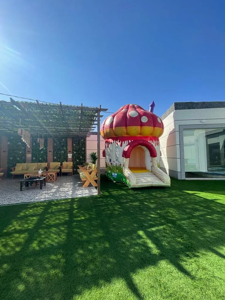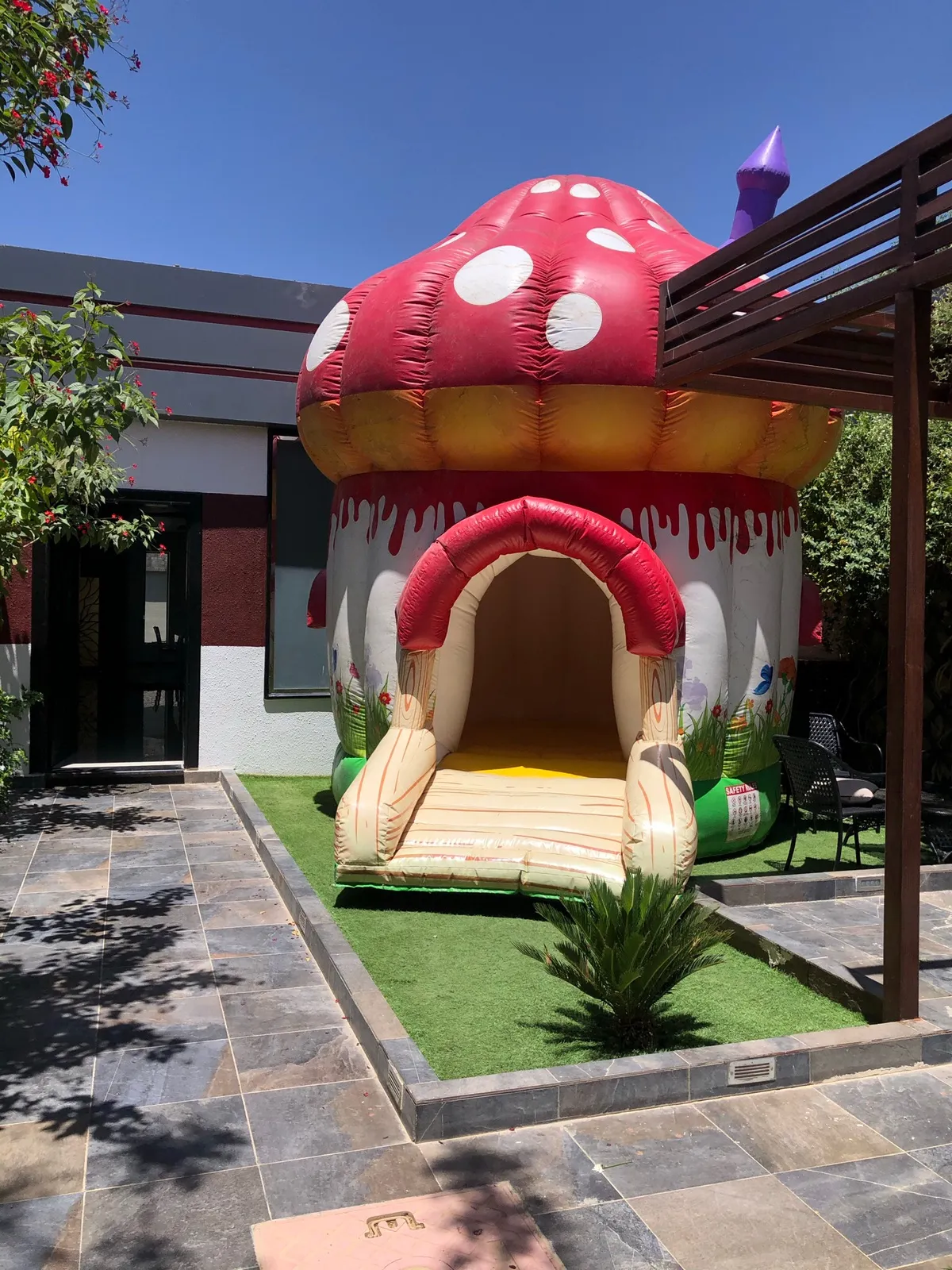 🍄 Mushroom Bounce House with Colorful Cartoon Design Fun and Safe Jumping Experience for Kids at Any Event Add a magical touch to your event with the Mushroom Bounce House, featuring a vibrant cartoon-style mushroom design that captivates children and encourages active play. With a 4-meter diameter and 4.5-meter height, it fits medium-sized spaces perfectly while maintaining high safety standards. ✅ Features: Eye-catching cartoon mushroom theme Perfect size for free movement and bouncing Durable, slip-resistant, and tear-proof materials Easy to set up, take down, and transport Promotes physical activity and group fun 📍 Ideal For: Birthday parties and family events Festivals and outdoor activities School functions and summer camps Public parks and play centers Entertainment events and carnivals