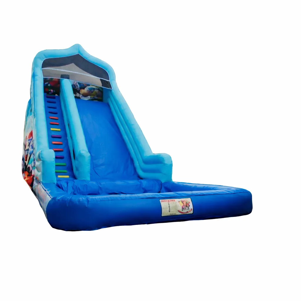 The Smurfs Water Slide is a large inflatable water slide designed in a distinctive blue color. It features a side climbing ladder and a wide sliding lane that ends in a splash pool at the bottom. It is suitable for parties, events, and summer activities, providing a fun and safe experience full of excitement for children. Dimensions: Height: 8 m Length: 11 m Width: 5 m