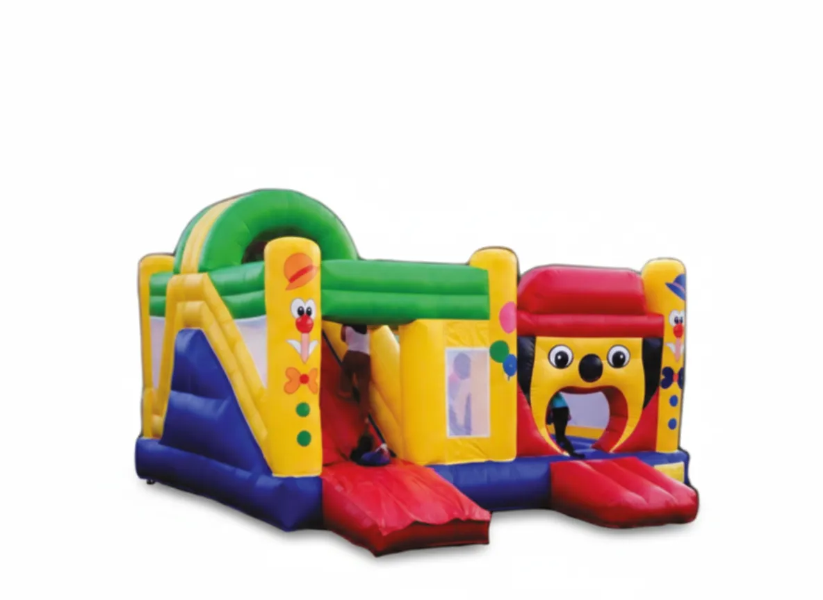 Add a touch of carnival fun to your events with "The Hat" combo! This unit features a vibrant multi-colored design with laughing clown figures and offers a rich play area with exciting internal obstacles. The combo merges a safe bouncer with a double-exit slide, making it the perfect choice for large gatherings and open spaces that require energy and excitement. Dimensions: 3.5m Height | 5m Length. Key Features: Classic "Clown" theme, bright primary colors (yellow, red, blue), and a spacious play zone allowing multiple children to play together safely.