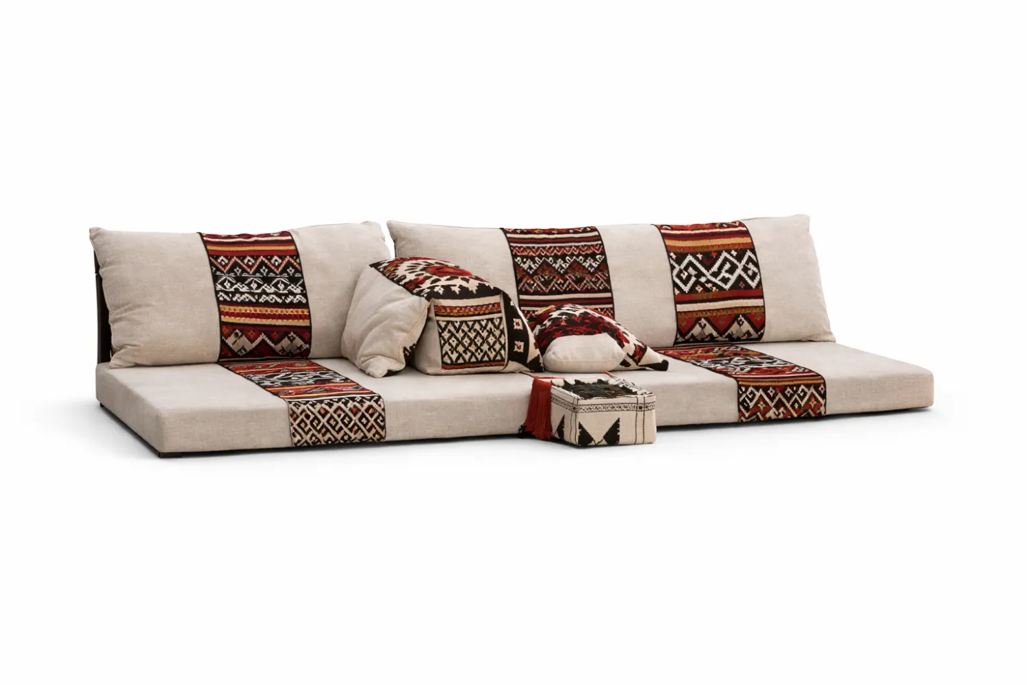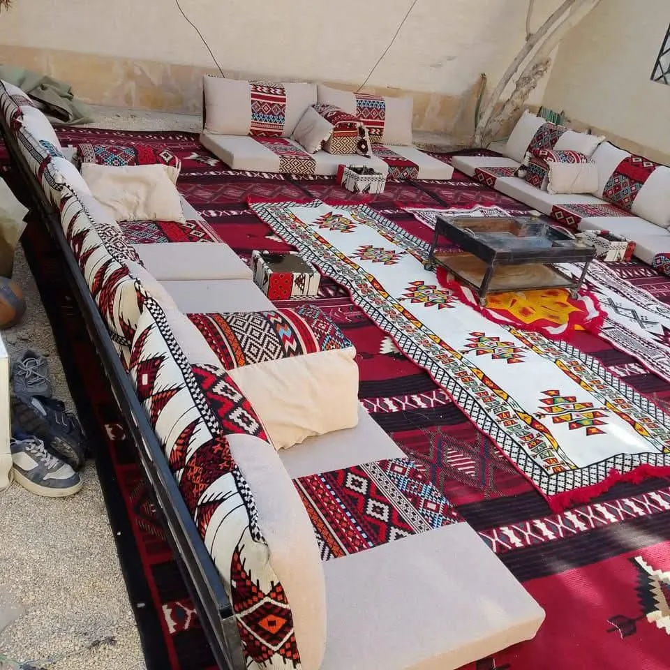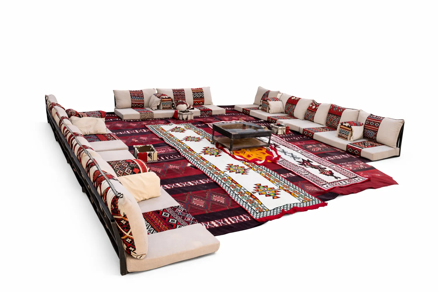 A traditional floor majlis seating set inspired by authentic heritage design, combining comfort with cultural elegance. It features comfortable floor cushions adorned with classic geometric patterns that add warmth and character to any space. This seating arrangement is ideal for traditional majlis setups, heritage events, private gatherings, lounges, and photoshoots, offering a complete traditional ambiance that blends seamlessly with other décor elements. Delivery: Free delivery within Riyadh. Product Features: Authentic traditional design with heritage patterns Comfortable floor seating suitable for extended use Durable materials ideal for rental purposes Easy to set up, dismantle, and transport Suitable for events, gatherings, and traditional occasions Perfect for photoshoots and cultural festivals