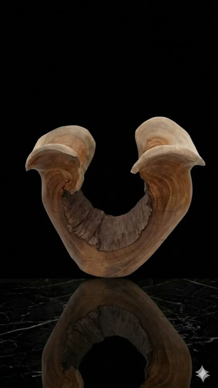 "عمل فني يجسد البساطة والرقي، حيث تم صقل جذع الخشب ليبرز انحناءاته العضوية وتشكيله الذي يشبه الجناحين أو القلب المفتوح. تتميز القطعة بتدرجات لونية دافئة وعروق خشبية واضحة تروي قصة نمو الشجرة عبر السنين. تصميمها التجريدي يجعلها مناسبة جداً للديكورات الحديثة (Modern) والريفية (Rustic) على حد سواء، كقطعة مركزية تضفي هدوءاً وجمالاً طبيعياً على المكان.