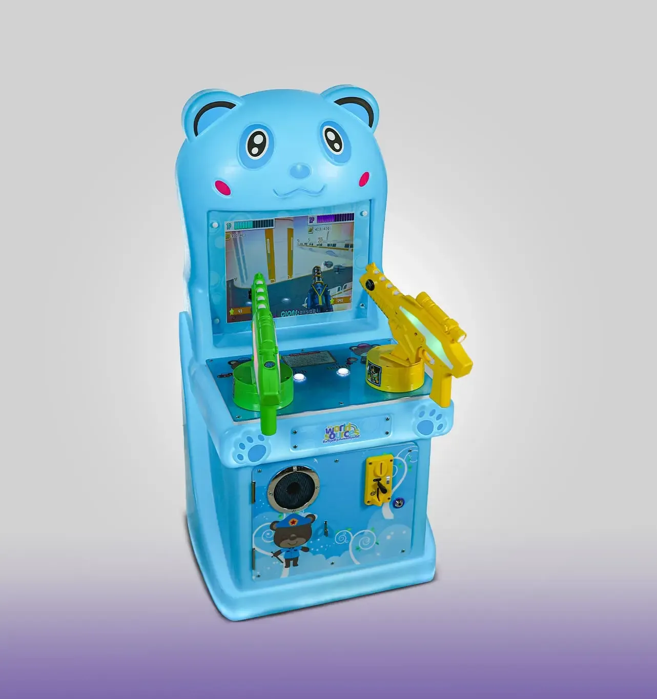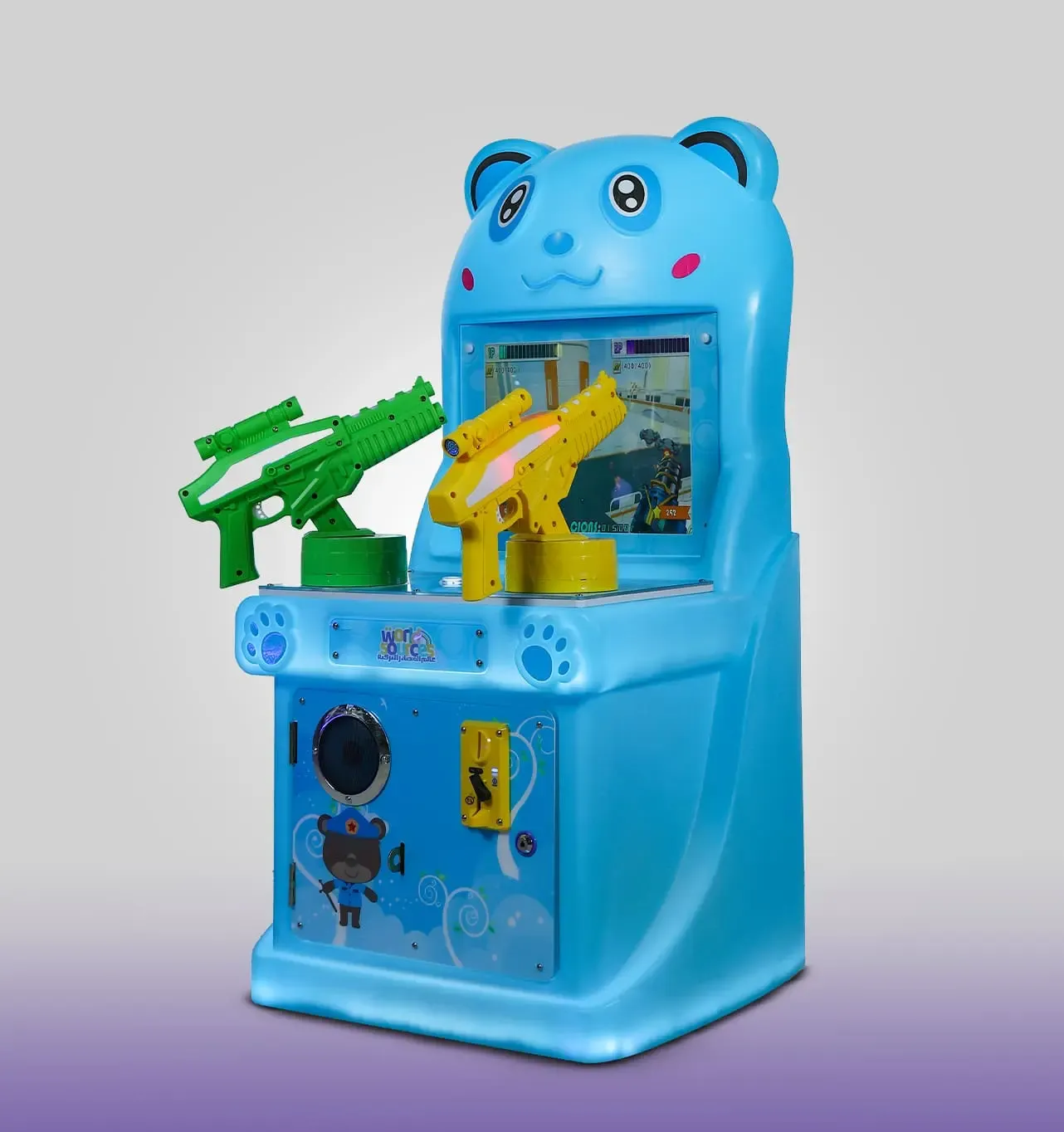 لعبة بندقية الدب الأزرق تجربة تصويب ممتعة وآمنة للأطفال، تجمع بين التركيز والإثارة، ومثالية للمهرجانات والمناسبات في السعودية أضف لمسة من الحماس والمرح إلى منطقة الألعاب الخاصة بك مع جهاز "بندقية الدب الأزرق". يتميز هذا الجهاز بتصميم كرتوني جذاب على شكل دب مبهج، مما يجعله القطعة المفضلة للأطفال في مراكز الترفيه والمولات. - تصميم مبهج وجذاب: هيكل خارجي متين باللون الأزرق السماوي على شكل دب لطيف مع إضاءات ملونة تجذب انتباه الأطفال من النظرة الأولى. - تجربة لعب ثنائية: الجهاز مزود بـ بندقيتين (خضراء وصفراء)، مما يسمح لطفلين باللعب معاً في وقت واحد، مما يعزز روح المنافسة والمشاركة. - شاشة عرض عالية الوضوح: شاشة مدمجة تعرض مغامرات تفاعلية ورسومات حركية تزيد من واقعية تجربة التصويب. - نظام صوتي تفاعلي: مكبرات صوت مدمجة تصدر مؤثرات صوتية حماسية تتفاعل مع أحداث اللعبة، لتعيش الطفل في قلب المغامرة. - سهولة الاستخدام: مزود بفتحة مخصصة للعملات ، - سهل الإدارة لمراكز الألعاب. - آمن ومتين: مصنع من مواد عالية الجودة تتحمل الاستخدام المكثف، مع زوايا مستديرة لضمان سلامة الأطفال أثناء اللعب. المقاسات : L 0.55m × W 0.55m × H 1.18m التوصيل مجانا لمدينة الرياض