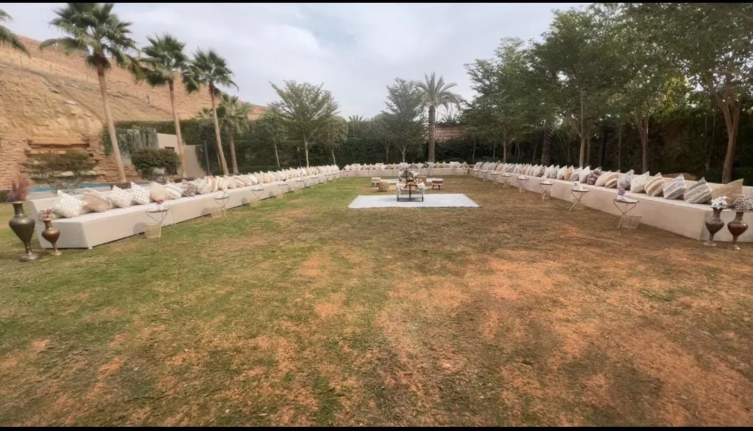جلسة خارجية فاخرة مصممة بعناية لتوفير أجواء راقية ومريحة في الفعاليات والمناسبات الخاصة. تتميز بتوزيع أنيق ومنظم يسمح باستقبال عدد كبير من الضيوف بأسلوب يعكس الفخامة والاهتمام بالتفاصيل، مع مساحات واسعة للحركة والتفاعل. تعد خيارًا مثاليًا للمناسبات الرسمية وشبه الرسمية، حيث تجمع بين الراحة، الجمال البصري، والعملية، مما يعزز تجربة الضيوف ويمنح الحدث طابعًا مميزًا ولافتًا. التوصيل داخل الرياض مجاناً