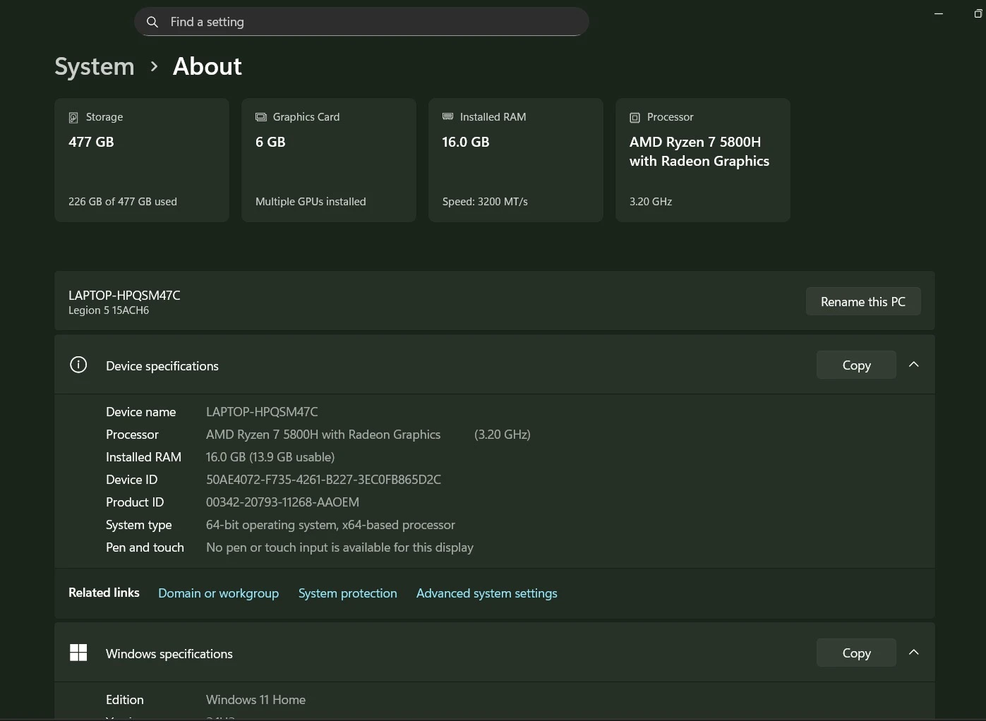 🔹 المعالج: AMD Ryzen 7 5800H بسرعة 3.20GHz 🔹 الرام: 16GB (سرعة 3200MT/s) 🔹 كرت الشاشة: 6GB (ممتاز للتصميم والجرافيكس) 🔹 التخزين: 477GB SSD 🔹 النظام: Windows 11