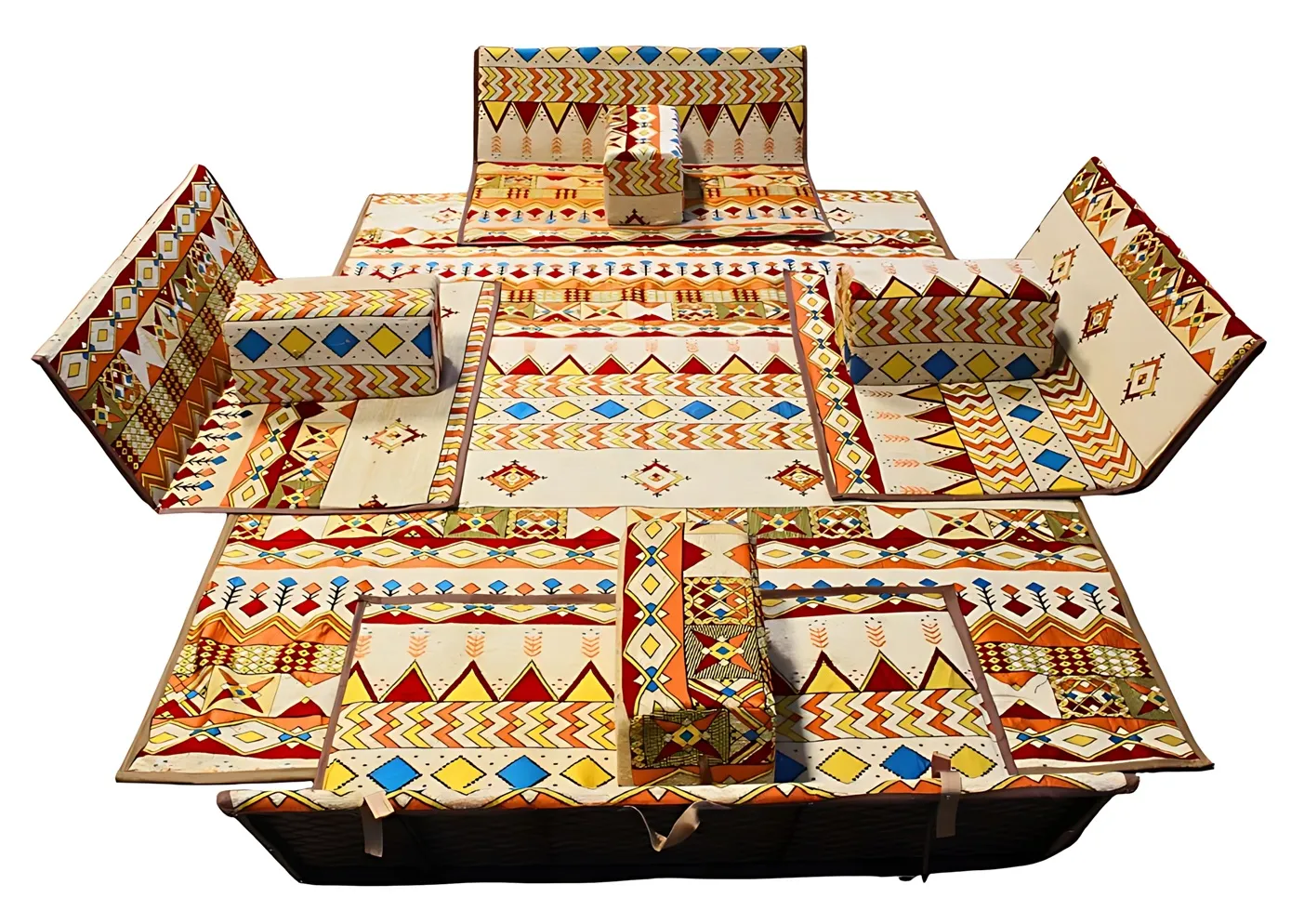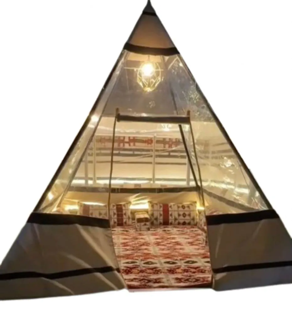 خيمة بر هرمية مقاس 3 م ف 3 م شفافة تتيح الاستمتاع بالمنظر الخارجي مع طقم جلسة بر بنقشة تراثية و 4 مراكي وفرشة بنفس النقشة