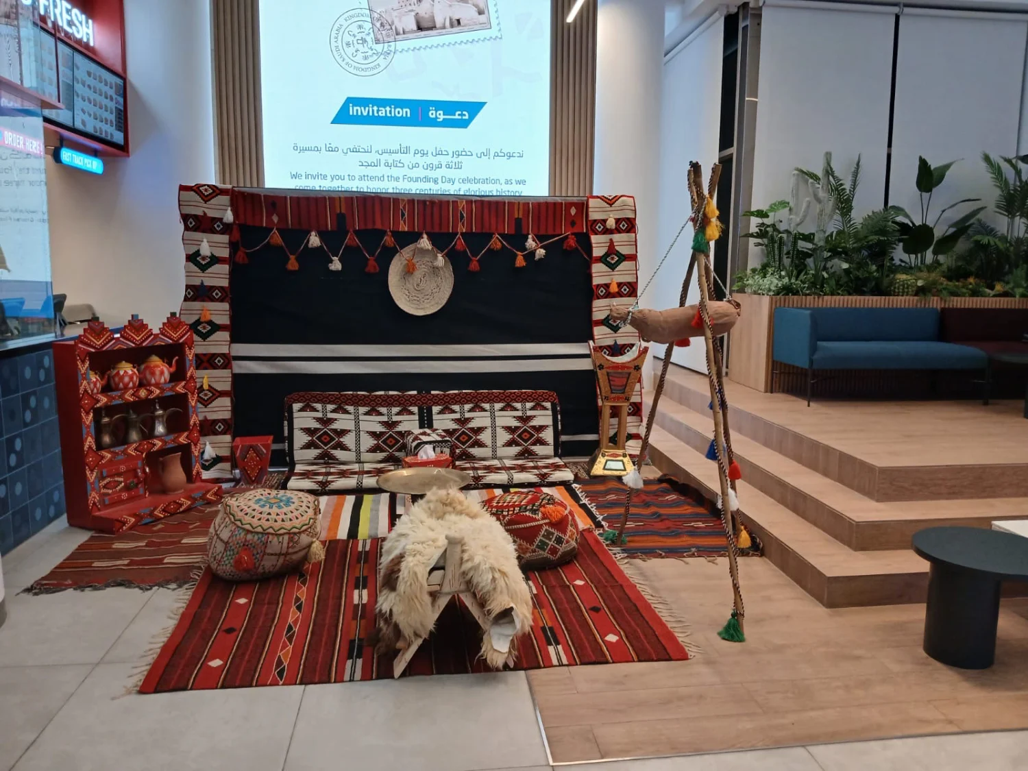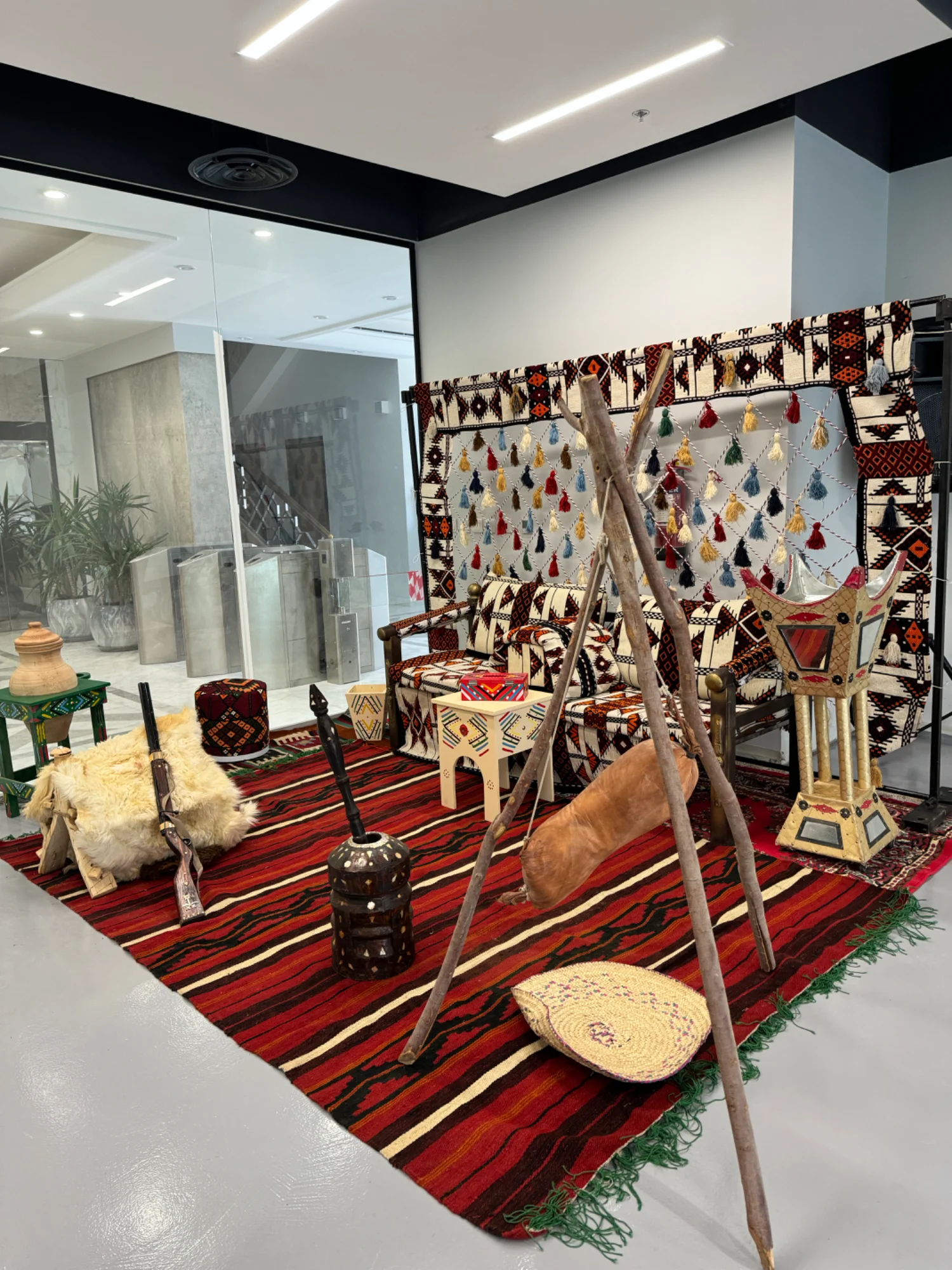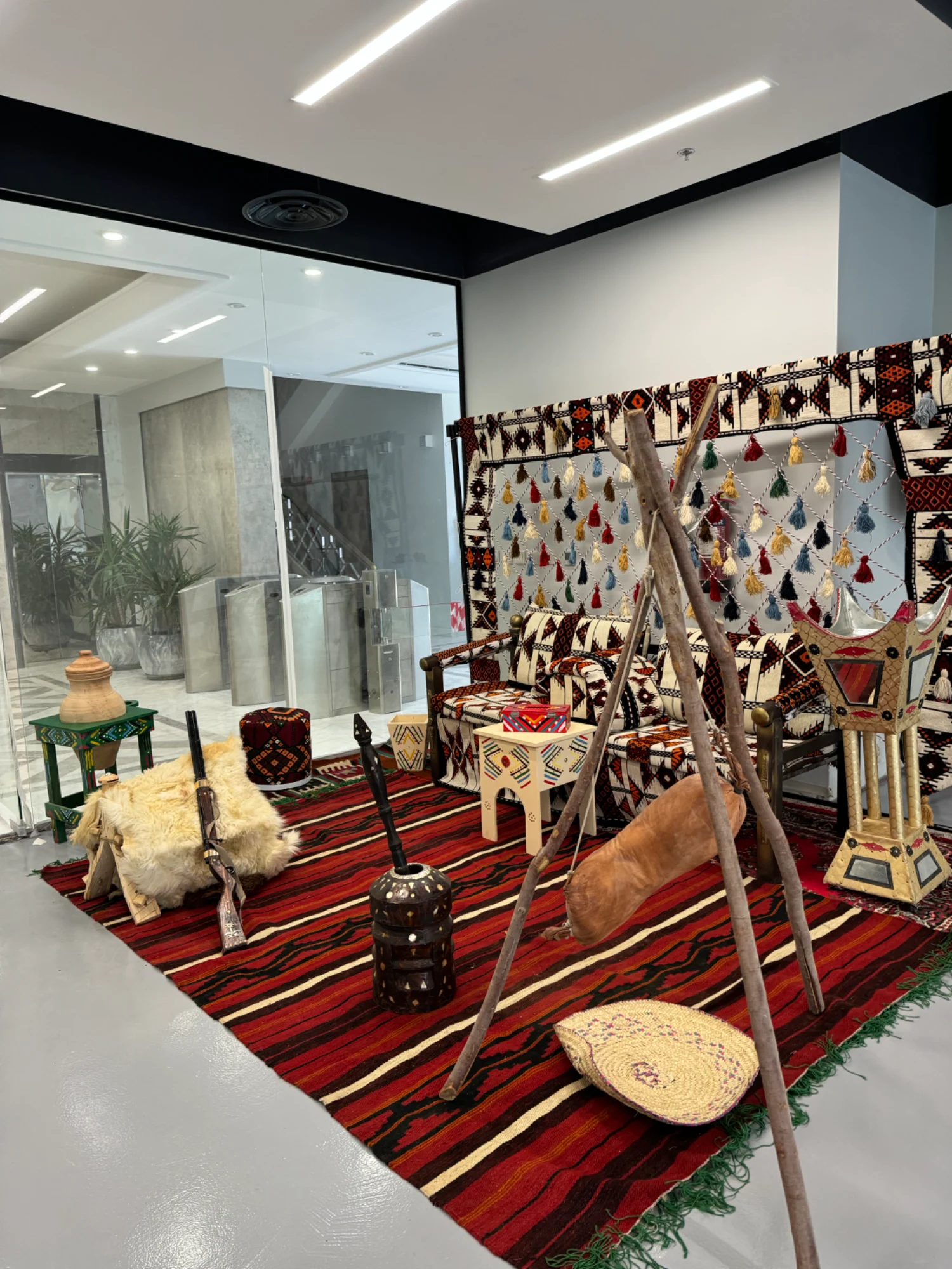 ركن شعبي تراثي مع خلفيه سدو مقاس ٣ متر ارتفاع ٢ متر مع الفرش وجلسه ارضيه او مرتفعه وتشكيله متنوعه من الديكورات التراثيه