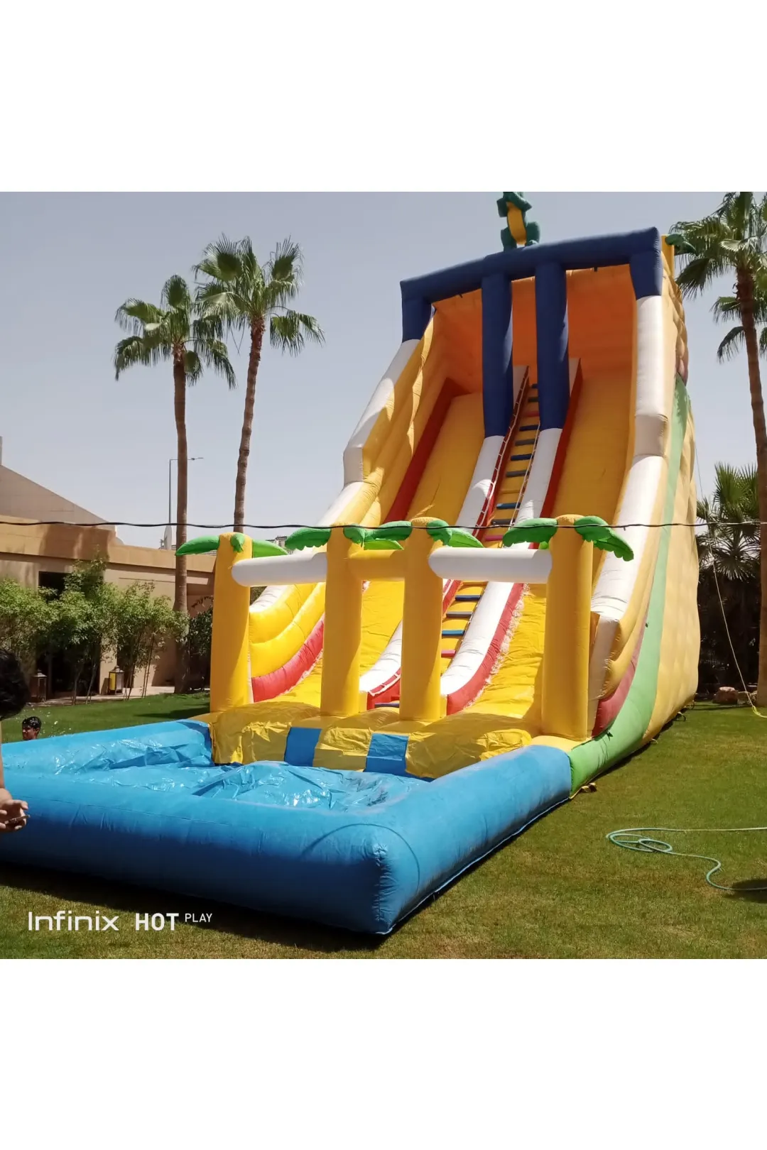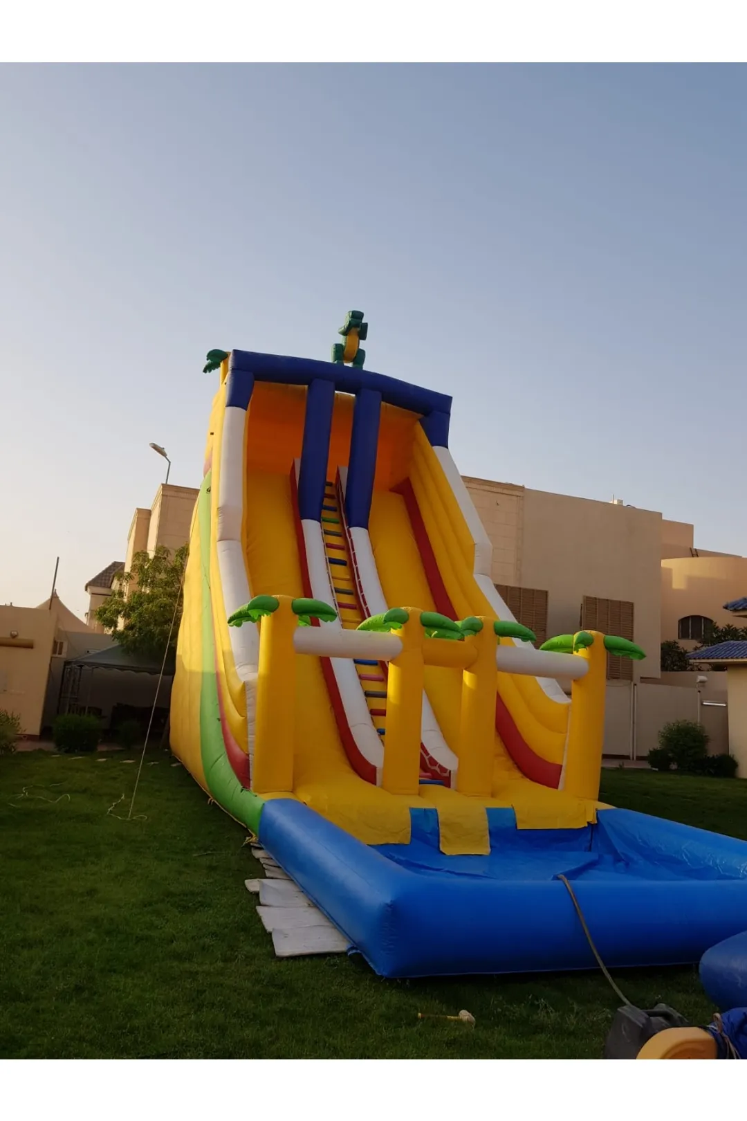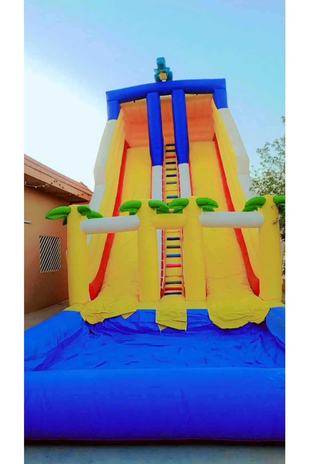 زحليقة النخيل المائية الصفراء لعبة مائية منعشة بتصميم استوائي مستوحى من أجواء الشواطئ والنخيل، تضيف طابعًا صيفيًا مشرقًا مليئًا بالمرح والحيوية. لونها الأصفر الجذاب يعكس أجواء السعادة والطاقة، ويشجع الأطفال على الحركة والانزلاق في بيئة آمنة وممتعة. مناسبة للحفلات الصيفية، المنتجعات، الشواطئ، والفعاليات الترفيهية، ومصنوعة من خامات قوية ومقاومة للماء لضمان أعلى مستويات الأمان والمتانة. المقاسات: الارتفاع:10 متر الطول: 12 متر العرض: 5 متر