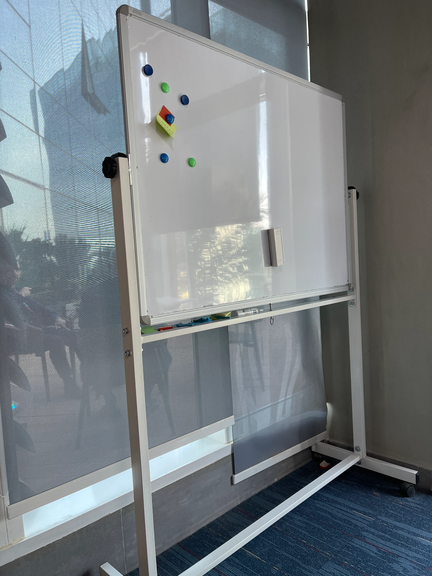 سبورة بيضاء كبيرة – وجهين، مغناطيسية، متحركة سبورة بيضاء كبيرة مناسبة للمكاتب، المدارس، أو أي استخدام مكتبي. سهلة الكتابة والمسح، مثالية للاجتماعات أو العروض التقديمية. نظيفة وبحالة ممتازة، وجاهزة للاستخدام. المميزات: • سبورة متينة، وجهين، بسطح مغناطيسي، تتحمل الاستخدام الكثيف. • تستخدم أقلام السبورة التقليدية والممحاة دون ترك آثار. • السطح الأمامي: فولاذ أبيض مينا (بولّي/بورسلين)، الخلفي: فولاذ مجلفن، الوسط: خشب بسماكة 12 مم. • إطار فاخر من الألومنيوم (فضي أو ألوان). • حامل سبورة حديدي أنبوبي مع 4 عجلات (2 منها بفرامل) لتحريكها بسهولة وتثبيتها بأمان. • مزودة بحامل أقلام. • أبعاد السبورة: 122 سم × 202 سم.