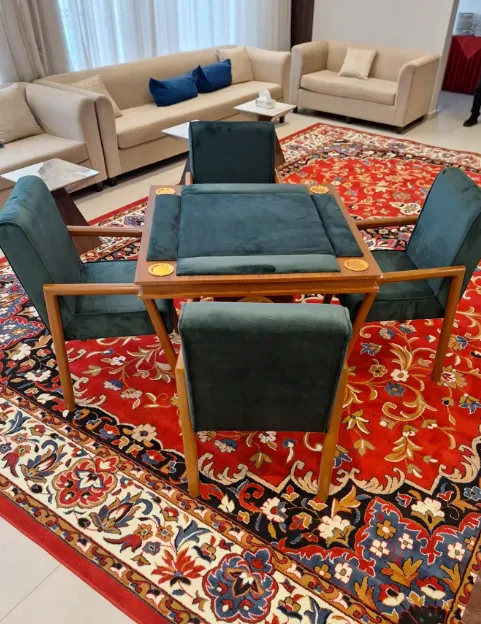 استمتع بتجربة لعب بلوت لا مثيل لها مع هذه الطاولة الفاخرة، المصممة خصيصًا لتوفير الراحة والجمالية. السطح المبطّن باللون الأخضر الداكن يمنح اللاعبين شعورًا بالراحة، بينما تضيف مساند الأذرع الخشبية لمسة من الأناقة. الطاولة والكراسي مصنوعة من أجود أنواع الخشب الطبيعي، مع تنجيد مخملي ناعم يمنحها مظهرًا راقيًا ومميزًا. متاحة للإيجار: تتوفر هذه الطاولة للإيجار اليومي أو لفترات أطول حسب طلبك. سواء كنت تخطط لليلة ألعاب خاصة أو ترغب في تجهيز مساحتك الترفيهية لحدث ما، يمكننا تلبية احتياجاتك.