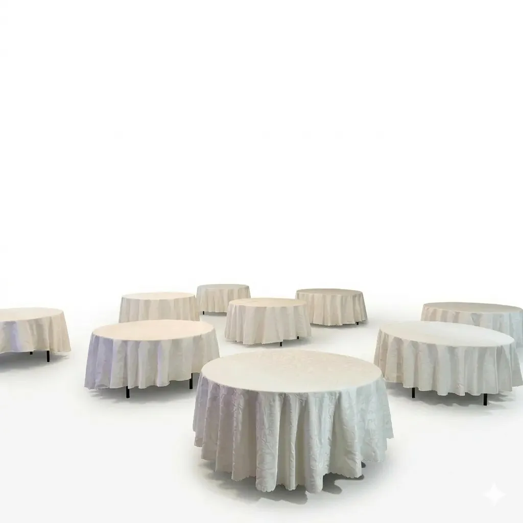 للمناسبات الكبيرة والولائم الفاخرة، نقدم لكِ الطاولة المستطيلة بالحجم الكبير. تتميز بمساحة واسعة وشكل منظم يضفي فخامة على المكان: المقاس: حجم ملكي كبير (180 سم × 80 سم). السعة: الطاولة مصممة لتتسع لـ 8 كراسي بشكل مريح جداً. المفرش: ملحق بها مفرش أبيض فاخر ينسدل حتى الأرض، مما يوفر خلفية بيضاء نقية ويخفي معالم الطاولة السفلية لمظهر أكثر رقيًا. الاستخدام: الخيار الأول لطاولات الطعام الرئيسية في الأعراس، بوفيهات التقديم الكبيرة، واجتماعات المؤتمرات.
