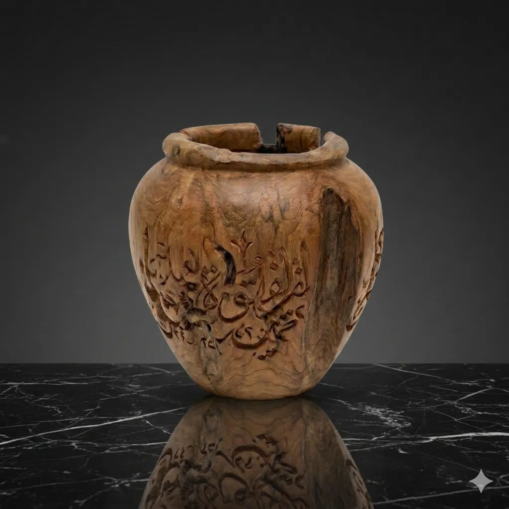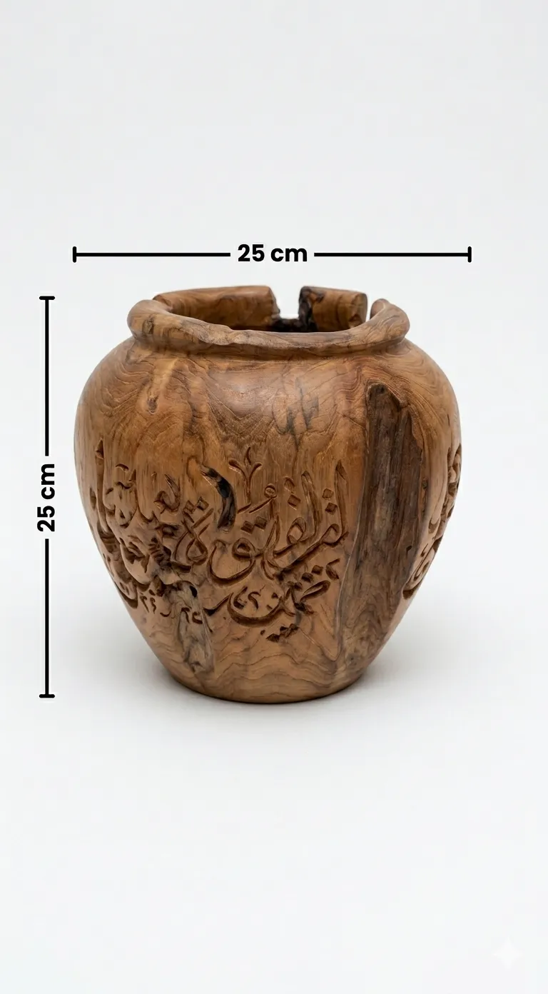 "تحفة فنية تجمع بين أصالة الخشب وسحر الخط العربي: استمتعي بجمال هذه الفازة الاستثنائية المنحوتة يدوياً من الخشب الطبيعي. ما يميز هذه القطعة هو التناغم المذهل بين الحروف العربية المنحوتة بدقة، وبين الفراغات والشقوق الطبيعية الموجودة في قلب الجذع، مما يجعلها قطعة ديكور تحاكي المتاحف الفنية في منزلك. لماذا تختارين هذه القطعة؟ نحت ثلاثي الأبعاد: النقوش العربية تلتف حول الفازة لتعطي شكلاً جمالياً من كل الزوايا. خشب معتق: يتميز بتموجات لونية دافئة تضفي هدوءاً وفخامة على المكان. تصميم عضوي (Organic Design): الفتحة الجانبية الطبيعية ليست عيباً، بل هي ميزة تصميمية تعزز من طابع ""الروستيك"" البدائي والراقي في آن واحد. عمل يدوي شاق: استغرق نحت هذه الحروف وقتاً طويلاً لتظهر بهذا البروز والجمال. الاستخدامات: قطعة فنية مستقلة للمكاتب والمجالس الفخمة. ركن أساسي في ديكورات(Boho) والـ (Rustic). هدية قيمة جداً للشخصيات التي تقدر الفن اليدوي والخط العربي. 3. المواصفات (Specifications) الخامة: خشب طبيعي 100%. التصميم: نحت يدوي غائر وبارز للحروف العربية. الحالة: تحافظ على القشرة والعقد الطبيعية للخشب. ""ملاحظة: نظراً لأن هذه المزهريات مصنوعة من جذوع الخشب الطبيعي، فإن تفاصيل العروق، التدرجات اللونية، والفتحات أو التعرجات الخشبية الخارجية تختلف من قطعة لأخرى، مما يمنح كل مزهرية شخصية فريدة وهويّة فطرية لا تتكرر. يمكنكم طلب صور حقيقية للقطع المتوفرة حالياً قبل الشحن عبر التواصل معنا، لضمان اختياركم القطعة الأنسب لذوقكم الخاص."""