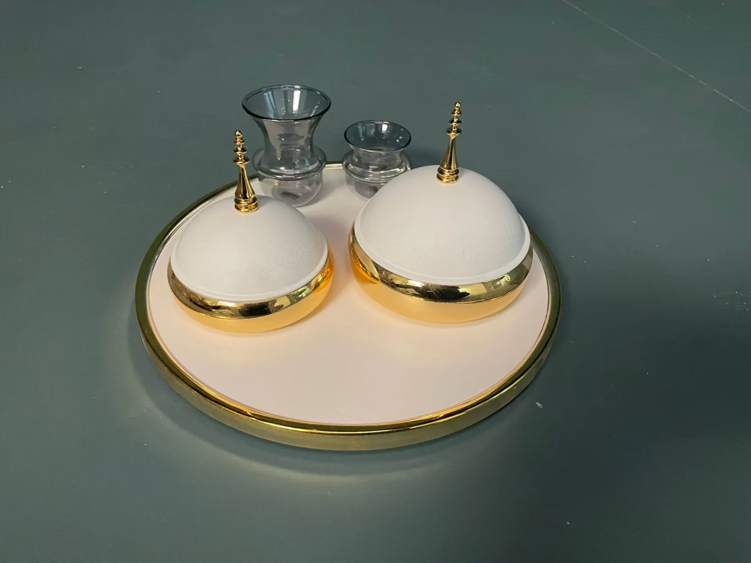 طقم فناجين قهوة مع تمرية باللونين الذهبي والأبيض، مُعدّ كبروب سينمائي يمنح المشهد لمسة ضيافة فاخرة تتناغم داخل الكادر، ويعزّز الطابع الثقافي في اللقطات بشكل واقعي دون التأثير على عناصر التصوير أو حركة الكاميرا. يُبرز تفاصيل الضيافة الخليجية داخل اللوكيشن بطريقة مناسبة للأعمال الدرامية والإعلانية، مع ظهور متوازن داخل المشهد يدعم جودة الإنتاج ويضيف عمقاً بصرياً محسوباً. التوصيل متاح للرياض والمدن المجاورة