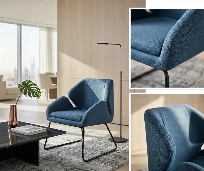 تخيل هذا الكرسي في زاوية غرفتك أو مكتبك؛ إنه ليس مجرد قطعة أثاث، بل هو تحفة فنية تجمع بين التصميم الهندسي المبتكر والراحة القصوى. بفضل لونه الأزرق العميق وقاعدته المعدنية الرشيقة، يضفي هذا الكرسي طابعاً من الرقي المودرن على أي مساحة