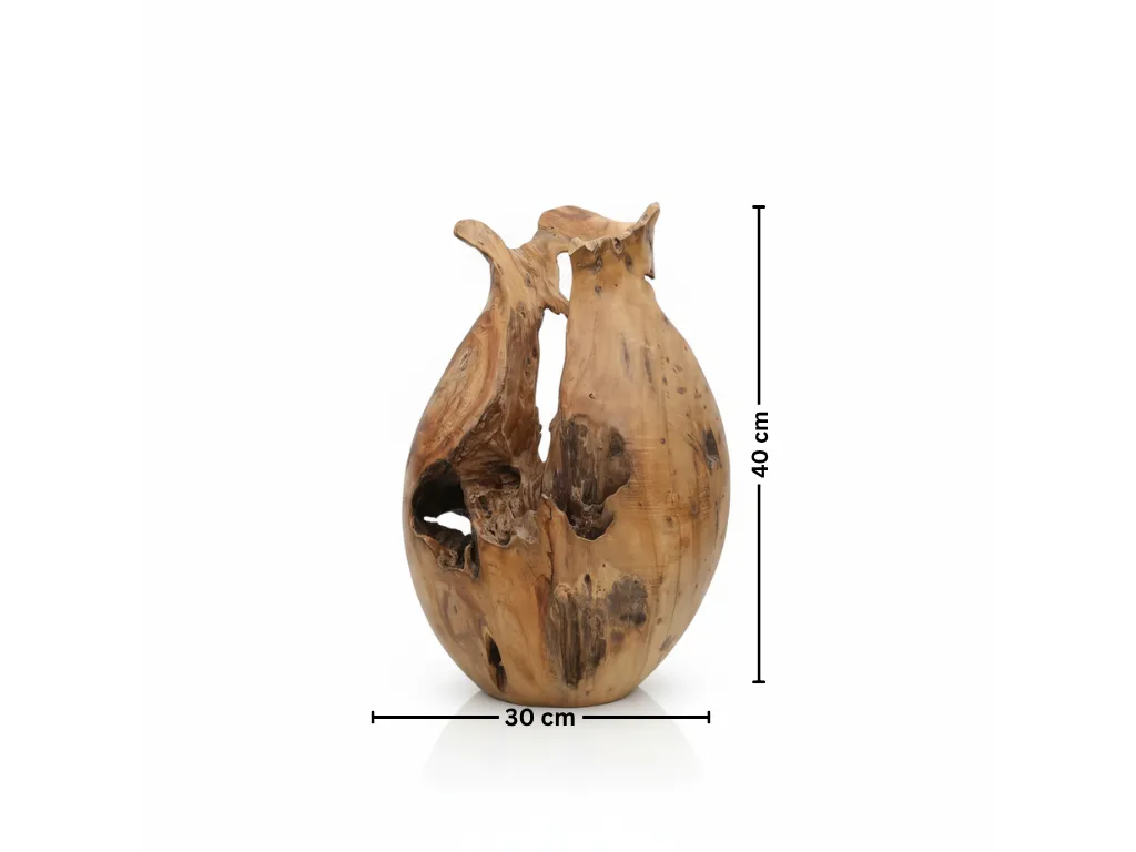 "تحفة فنية تعيد تعريف مفهوم المزهرية التقليدية: هذه المنحوتة ليست مجرد قطعة خشبية، بل هي محاكاة فنية لشكل ""الفازة العضوية"". بفضل انحناءاتها المصقولة وتجويفها المركزي، تظهر وكأنها وعاء طبيعي انبثق من الأرض. الفوهة العلوية للقطعة، بتعرجاتها الطبيعية التي تشبه حواف أوراق الشجر أو بتلات الزهور، تمنحها طابعاً أنثوياً ناعماً رغم صلابة الخشب المعتق.
