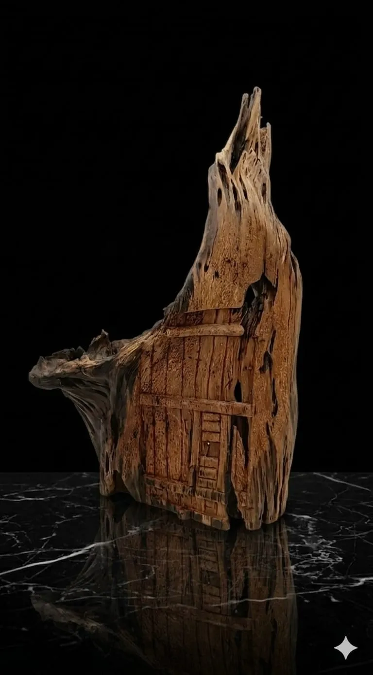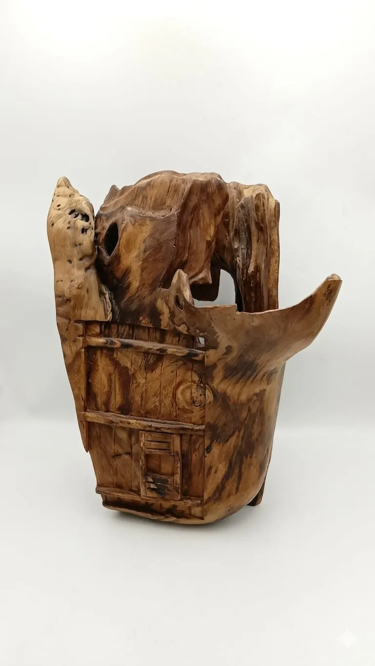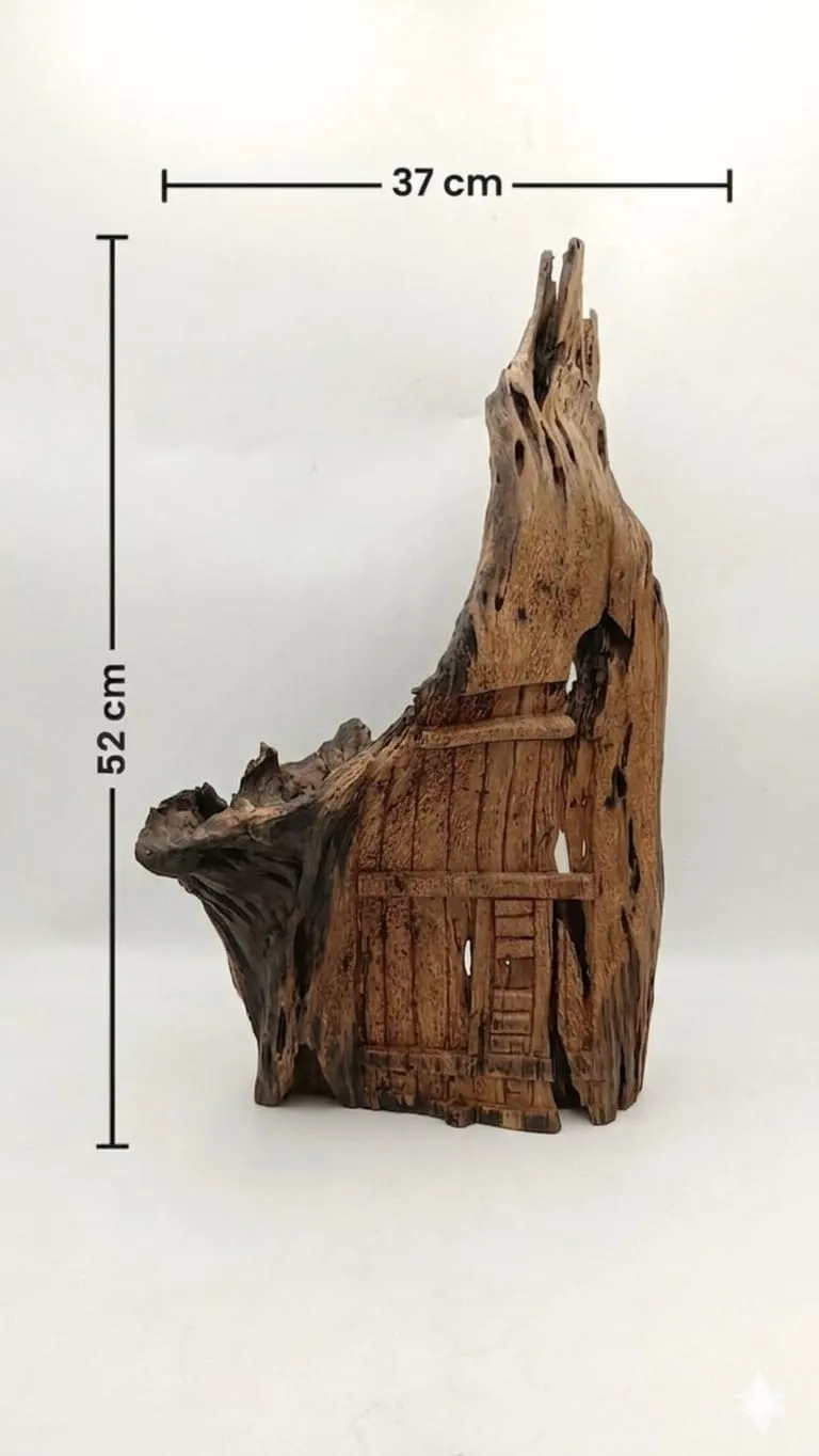 تكامل مذهل مع الجذع: تم دمج الملامح المعمارية المنحوتة مع التعرجات والنتوءات الأصلية للخشب، ليظهر العمل وكأن القلعة تنبثق من قلب كتلة خشبية صلبة ومعتقة.