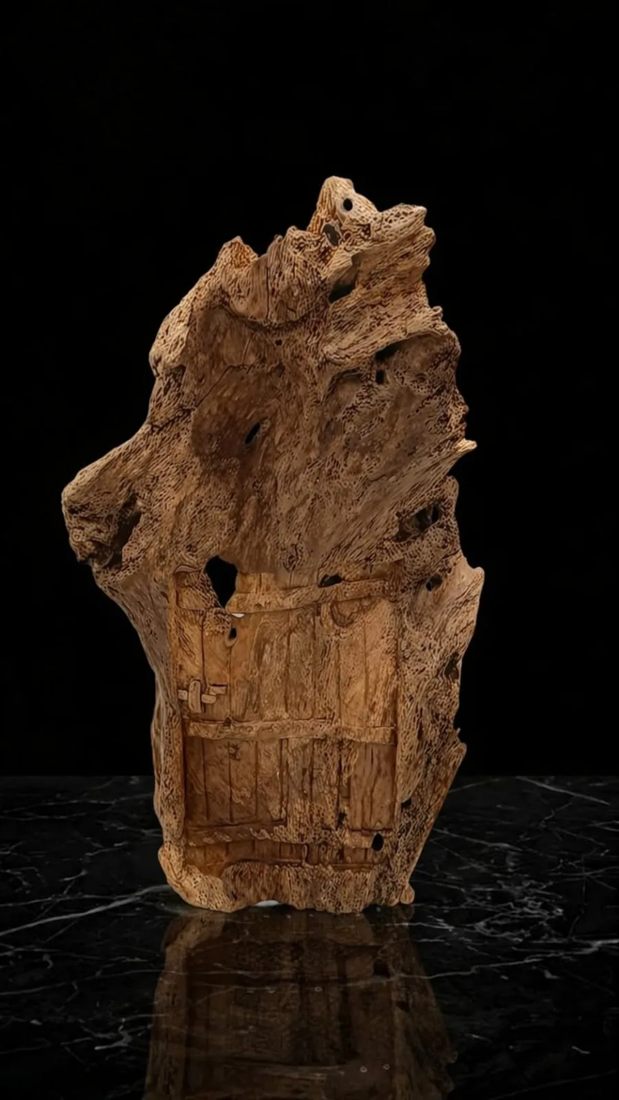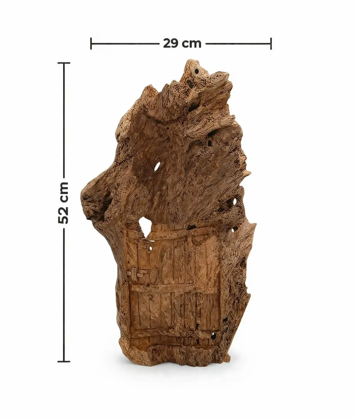 "رحلة بصرية إلى عالم الأساطير الخشبية: اقتني هذه القطعة الاستثنائية التي تتجاوز حدود الديكور التقليدي. نحن أمام عمل فني ساحر، حيث تم استغلال كتلة خشبية طبيعية معتقة، تمتاز بقوامها المسامي الفريد وعوامل التعرية الطبيعية، لتصبح مسرحاً لنحت معماري خيالي ومدهش يصور ""بوابة قديمة"" غائرة بألواحها وتفاصيلها الدقيقة من قلب الجذع. هذه المنحوتة تجمع بين صلابة الطبيعة الخام ودقة اللمسة البشرية التي تحكي قصة زمن غابر.