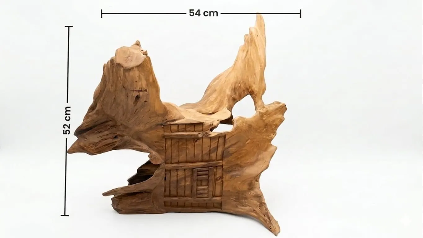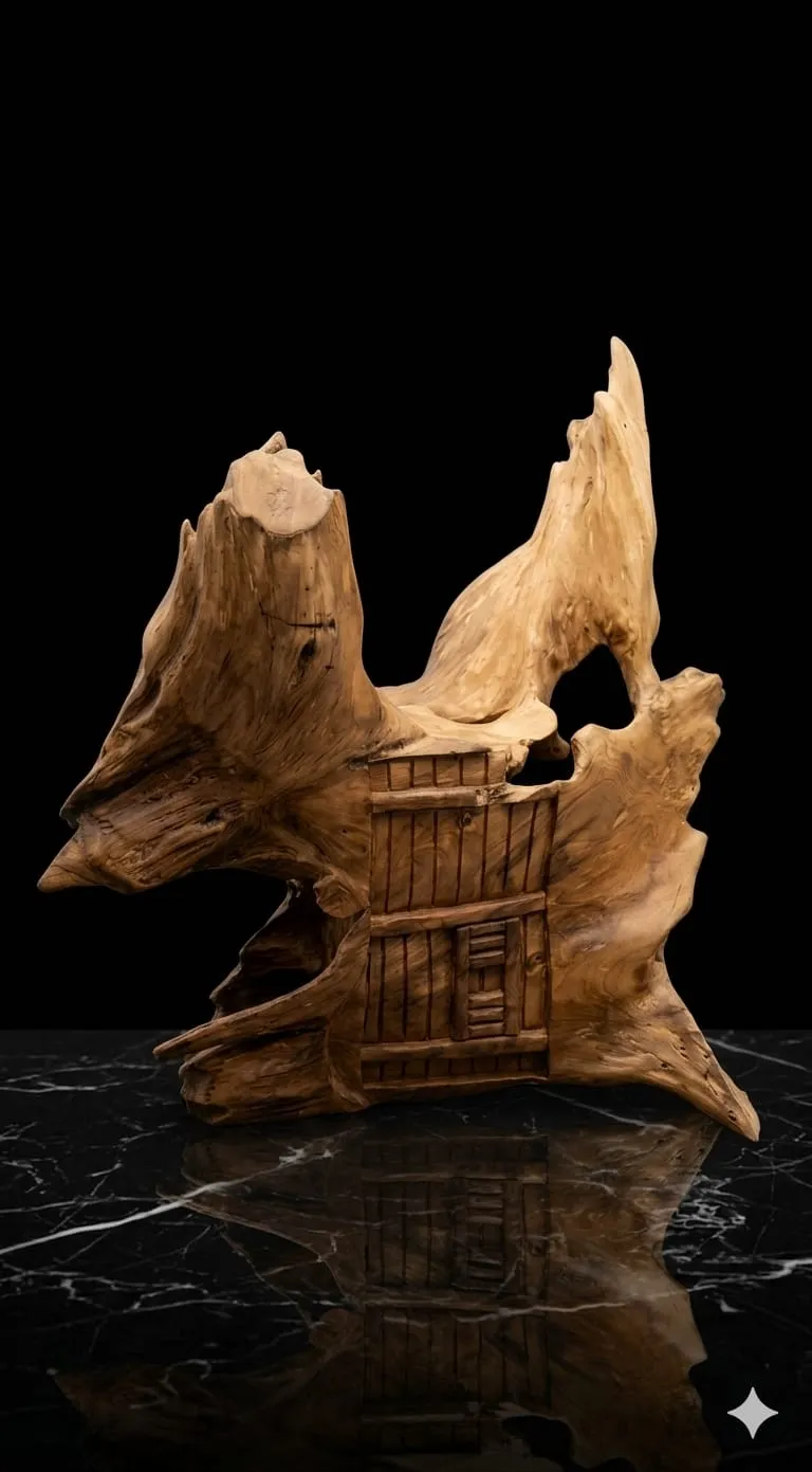 "نافذة على الفن والجمال الطبيعي: اقتني قطعة ديكور تتحدث لغة الخيال مع هذه المنحوتة الفريدة من الخشب الطبيعي الأصلي. ما يميز هذه القطعة هو التباين المذهل بين شكل الجذع الخام بأطرافه المدببة والطبيعية، وبين النحت الدقيق في منتصفه الذي يجسد ""باباً خشبياً عتيقاً"" بتفاصيل معمارية بارزة، مما يجعلها تبدو كأنها بوابة لعالم سحري داخل شجرة معمرة.