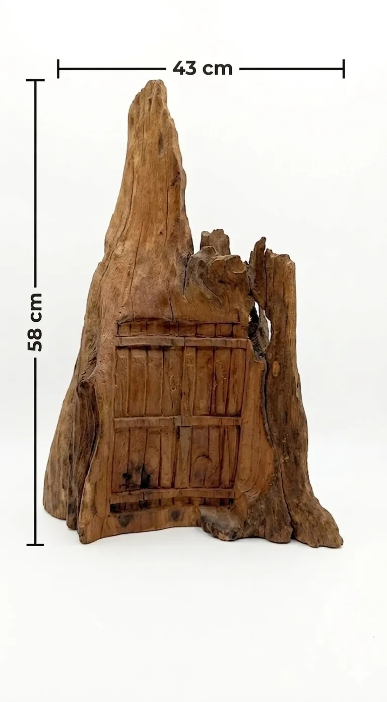 "رحلة بصرية إلى عالم الأساطير الخشبية: اقتني هذه القطعة الاستثنائية التي تتجاوز حدود الديكور التقليدي. نحن أمام عمل فني ساحر، حيث تم استغلال كتلة خشبية طبيعية معتقة، تمتاز بتعرجاتها الطبيعية وقوامها المسامي الفريد، لتصبح مسرحاً لنحت معماري خيالي ومدهش يصور ""بوابة قديمة"" غائرة بألواحها الطولية وعوارضها العرضية من قلب الجذع. هذه المنحوتة تجمع بين صلابة الطبيعة الخام ودقة اللمسة البشرية التي تحكي قصة زمن غابر.