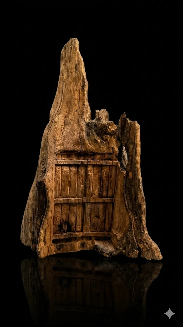 تداخل فني عضوي: التفاصيل المعمارية المنحوتة تبدو وكأنها اكتشاف نبت من قلب الجذع، مما يخلق تبايناً مذهلاً بين عوامل التآكل الطبيعية في الأعلى والدقة المعمارية المصغرة في الأسفل، مع الحفاظ على القشرة الخارجية الخام على الأطراف.