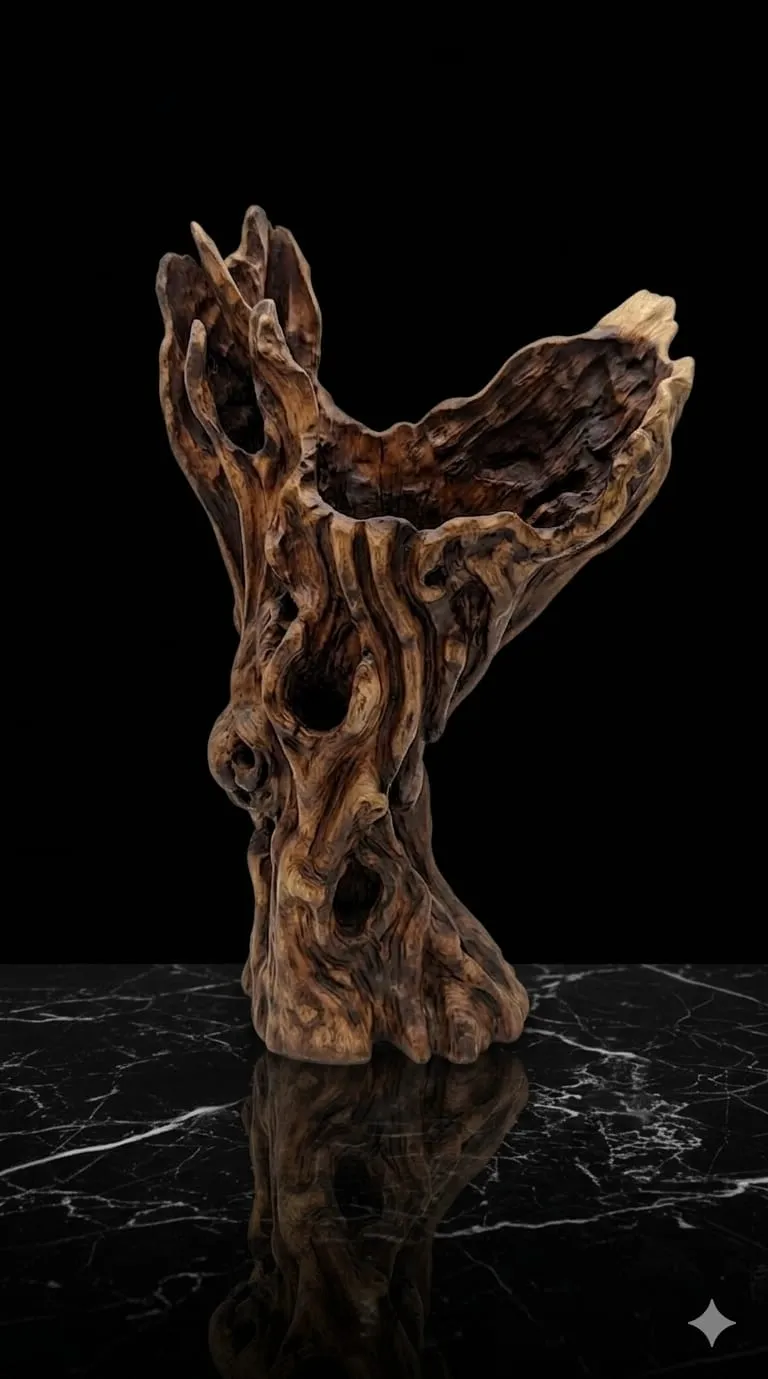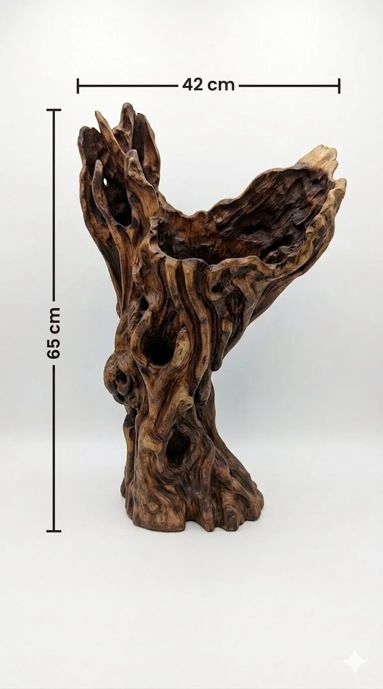 "جمال الطبيعة الصارخ في قطعة فنية: استعدي لإضافة قطعة ديكور ستكون محط أنظار الجميع. هذه المنحوتة المصنوعة من الخشب الطبيعي الأصلي تجسد المعنى الحقيقي للفن العضوي (Organic Art). تم الحفاظ على الفتحات والتجاويف التي شكلتها الطبيعة عبر السنين، وصقلها يدوياً لتتحول إلى تحفة فنية تحاكي جذوع الأشجار العتيقة. ما الذي يجعل هذه القطعة استثنائية؟ عمق بصري مذهل: التجاويف الطبيعية (Natural Hollows) تعطي للقطعة أبعاداً درامية وتسمح بمرور الضوء من خلالها بشكل ساحر. تدرجات لونية غنية: تظهر القطعة تباين ألوان خشببين البني الداكن ""المحروق"" والعسلي الفاتح، مما يبرز تفاصيل ""عروق"" الخشب بدقة. تصميم شاهق: تمتاز بارتفاع وتداخل في الأغصان العلوية، مما يعطيها حضوراً قوياً على طاولات المداخل أو زوايا المجالس الفخمة. قطعة ""واحد من واحد"": يستحيل تكرار هذه القطعة؛ فكل تجويف وكل انحناءة هي نتاج نمو الشجرة الطبيعي، مما يجعلها استثماراً فنياً خاصاً بكِ وحدكِ. أفكار للتنسيق: ضعيها كقطعة أساسية في مدخل المنزل مع إضاءة موجهة لإبراز الظلال داخل التجاويف. مثالية جداً للمنازل والمكاتب التي تعتمد نمط(Boho Luxury) أو الديكورات المستوحاة من الطبيعة. 3. المواصفات (Specifications) الخامة: خشب طبيعي 100%. التصميم: منحوتة شجرية طبيعية (Natural Tree Sculpture). التشطيب: يدوي مصقول مع الحفاظ على الفتحات الخام. ""ملاحظة: نظراً لأن هذه التحف مصنوعة من جذوع خشب طبيعية، فإن التجاويف، الفتحات، وتدرجات الألوان هي جزء أصيل من تاريخ الشجرة وجمالها الطبيعي، وتختلف من قطعة لأخرى. يمكنكم طلب صور حقيقية للقطع المتوفرة حالياً قبل الشحن عبر التواصل معنا، لضمان اختياركم القطعة الأنسب لذوقكم."""