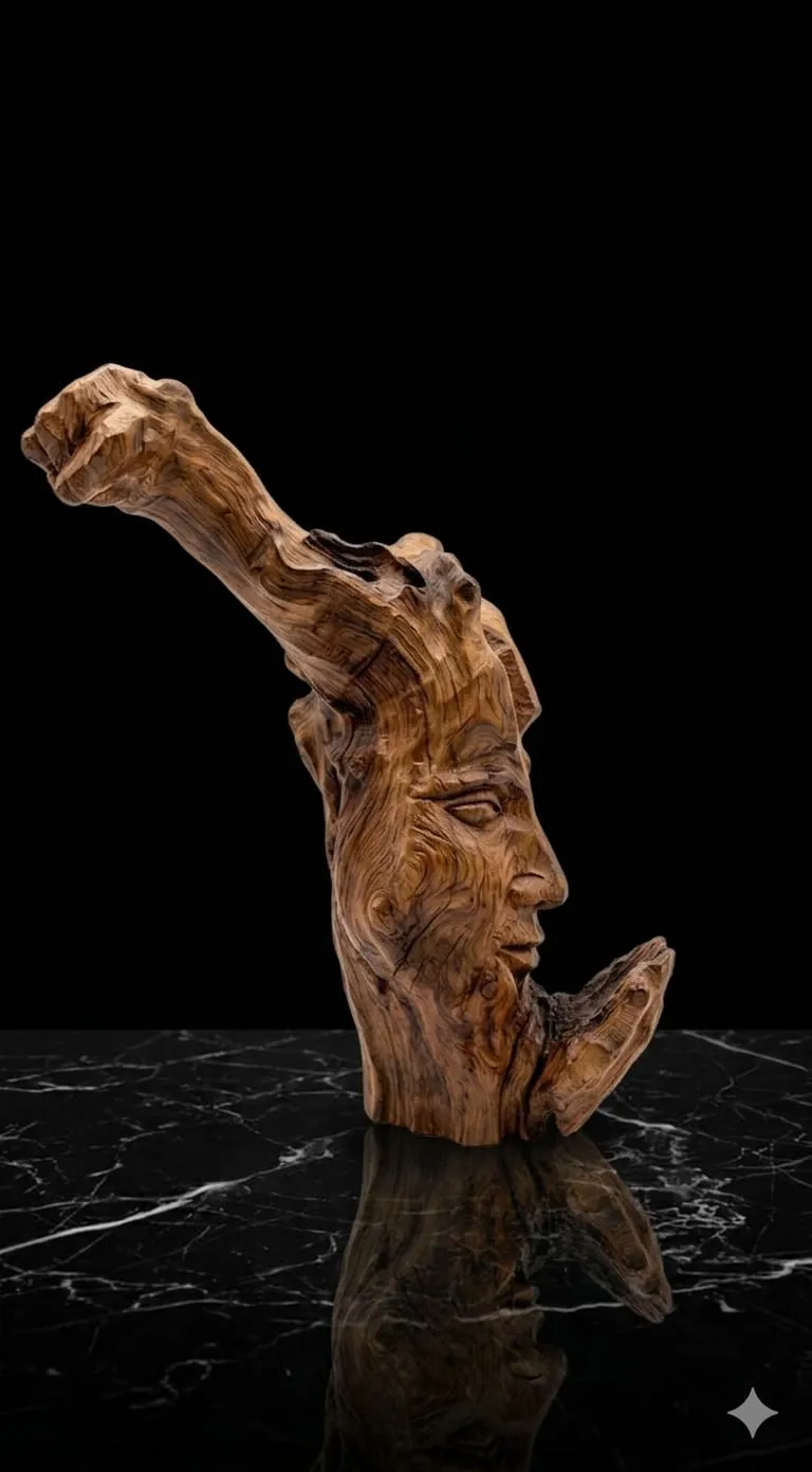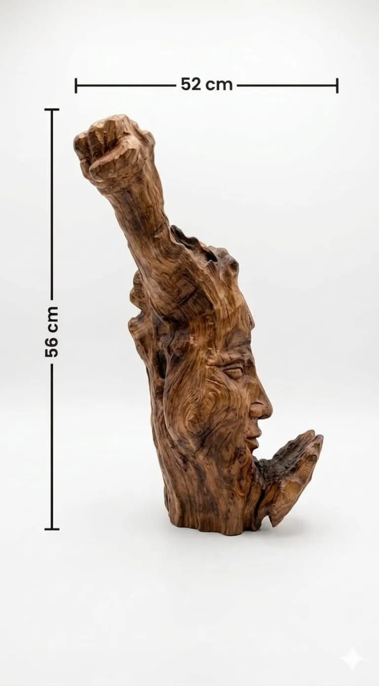 "عندما يتحدث الخشب بلغة الفن: نقدم لكِ قطعة فنية تتجاوز حدود الديكور التقليدي؛ منحوتة يدوية لوجه يفيض بالتفاصيل، حُفرت بدقة داخل جذع طبيعي. تم دمج ملامح الوجه المنحوتة مع التعرجات والنتوءات الأصلية للخشب، ليظهر العمل وكأن الوجه ينبثق من قلب الشجرة. لماذا هذه المنحوتة قطعة لا تقدر بثمن؟ تفاصيل دقيقة: تجاعيد الوجه، نظرة العين، واللحية المنحوتة تعكس مهارة يدوية فائقة في التعامل مع صلابة الخشب. تكامل مع الطبيعة: الامتداد الطبيعي للجذع في الأعلى يعطي تصميماً عضوياً فريداً لا يمكن تكراره في أي قطعة أخرى. خشب معتق: يتميز بألوانه الدافئة والمتداخلة التي تضفي لمسة من الوقار والفخامة على المجالس والمكاتب. قطعة متاحف: هذه المنحوتة ليست مجرد منتج، بل هي عمل فني (Masterpiece) مخصص لمن يبحثون عن اقتناء نوادر الفن اليدوي. أفكار للتنسيق: قطعة مركزية في المكاتب الرسمية أو مجالس الاستقبال الفخمة. توضع في ركن خاص مع إضاءة خافتة لتبرز تفاصيل النحت والظلال. هدية تذكارية فاخرة جداً في المناسبات الرسمية والافتتاحات. 3. المواصفات (Specifications) الخامة: خشب طبيعي 100%. نوع الفن: نحت وجوه (Figurative Carving). طريقة الصنع: عمل يدوياً بالكامل. ""ملاحظة: نظراً لأن هذه التحف منحوتة من جذوع خشب طبيعية، فإن شكل الجذع المحيط بالوجه، العروق، والتدرجات اللونية تختلف من قطعة لأخرى، مما يضمن لكِ الحصول على نسخة وحيدة وحصرية من هذا العمل الفني. يمكنكم طلب صور حقيقية للقطع المتوفرة حالياً قبل الشحن عبر التواصل معنا."""