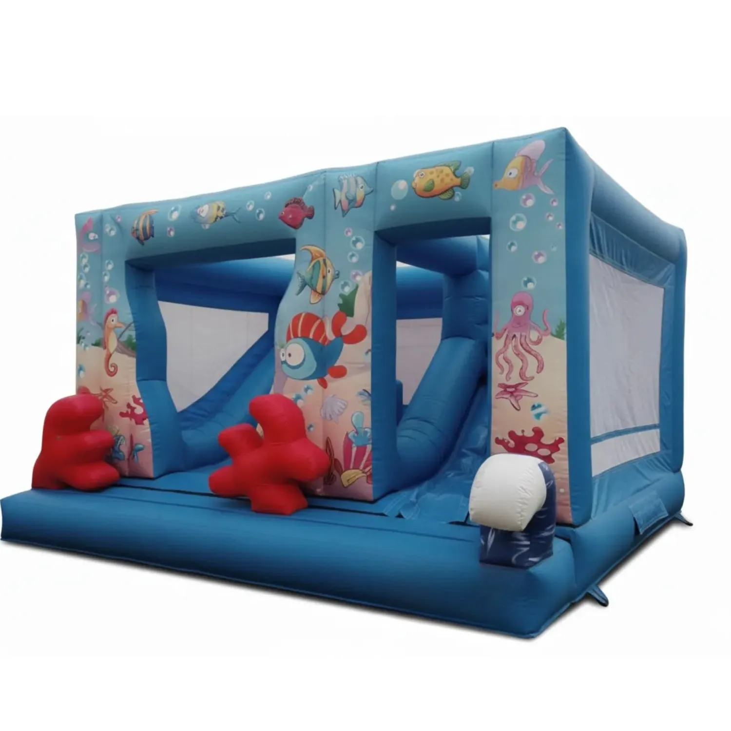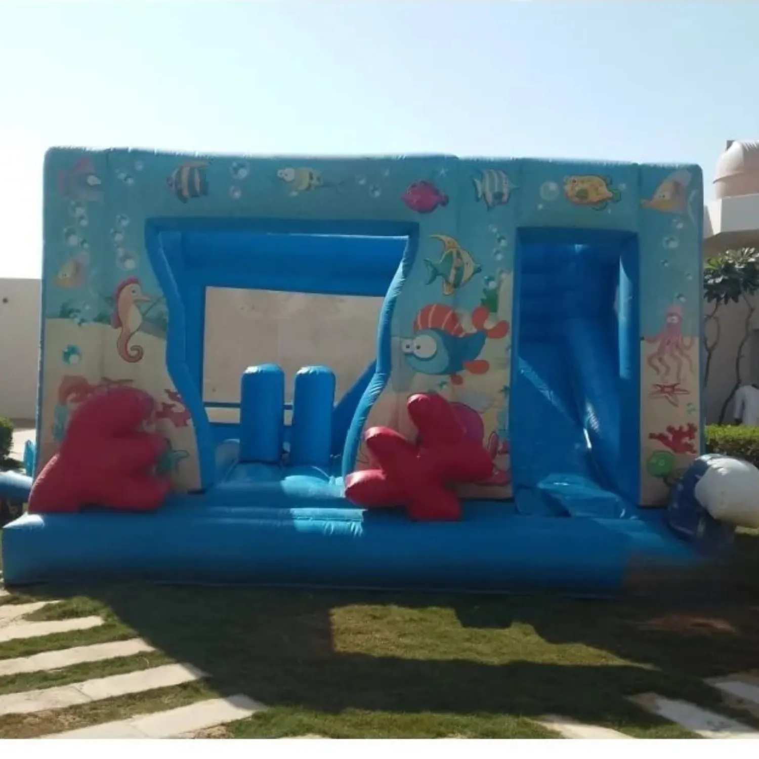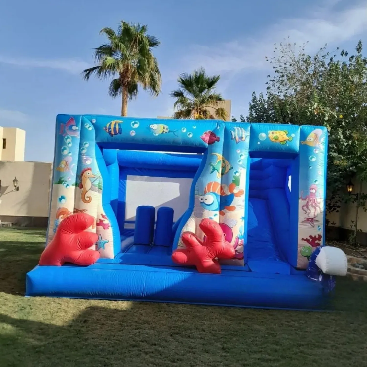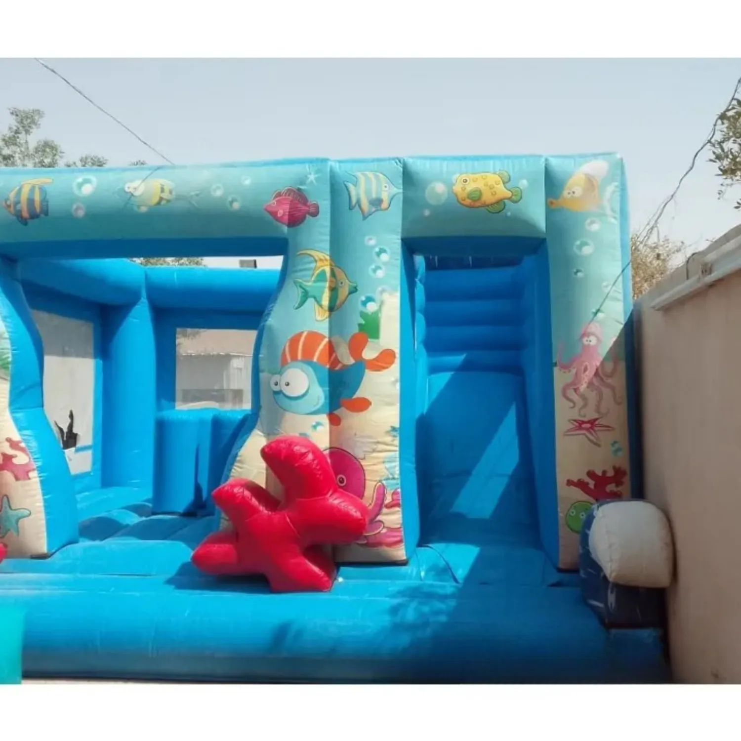 نطيطة وزحليقة عالم الأسماك لعبة ترفيهية مميزة تأخذ الأطفال في مغامرة بحرية مليئة بالحيوية والمرح. تجمع بين القفز والانزلاق داخل تصميم جذاب مستوحى من عالم الأسماك والألوان البحرية المبهجة، مما يجعلها نقطة جذب أساسية في الحفلات والمناسبات الترفيهية. مصنوعة من خامات آمنة ومتينة تضمن أعلى مستويات الأمان أثناء اللعب، ومناسبة للأطفال لممارسة النشاط والحركة في أجواء ممتعة ومليئة بالضحك.المميزات: تصميم مستوحى من عالم البحار والأسماك. تجمع بين النطيطة والزحليقة في لعبة واحدة. خامات آمنة ومناسبة للأطفال. مثالية للحفلات، الفعاليات، وأعياد الميلاد. المقاسات: الارتفاع: 3 متر الطول: 5 متر العرض: 5 متر