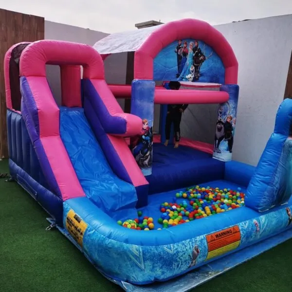 نطيطه وزحليقة وحوض كور فروزن – عالم ملون من المرح والتسلية قدم للأطفال تجربة فريدة من نوعها تجمع بين الحركة والمرح داخل تصميم ملون وجذاب مستوحى من أجواء عالم فروزن المحبب للجميع. هذه اللعبة المتكاملة بطول 4 متر وعرض 4 متر وارتفاع 4 متر، توفر بيئة آمنة ومثيرة تجمع بين القفز الحر، الانزلاق السلس، وحوض كور مليء بالكرات الملونة التي تضيف بعدًا جديدًا من التسلية. المميزات: تصميم مبتكر مستوحى من عالم فروزن يجذب الأطفال ويحفز خيالهم. خامات آمنة ومقاومة تضمن متانة طويلة وراحة أثناء اللعب. تركيبة متكاملة تشمل النطيطه، الزحليقة، وحوض الكرات الملون لتجربة شاملة. سهلة التركيب والفك مما يجعلها مثالية للفعاليات المؤقتة والمهرجانات. ألوان زاهية ومتناسقة تزيد من جاذبية اللعبة وتحفز الحركة والنشاط. أماكن الاستخدام المثالية: حفلات أعياد الميلاد والمناسبات العائلية. الفعاليات المدرسية والمهرجانات المجتمعية. مراكز الترفيه وأماكن اللعب. الحدائق العامة والمساحات المفتوحة. استمتع بتوفير تجربة ترفيهية مميزة وآمنة للأطفال، واجعل فعاليتك مليئة بالضحك والحيوية مع هذه اللعبة الملونة والجذابة. شروط الحجز على العميل التأكد من أن مساحة الموقع مناسبة لحجم الألعاب المطلوبة. لا يتم تركيب الألعاب على الرمل أو الأسطح غير المستوية، كما لا يتم تركيبها في الأدوار العليا نهائيًا. مسؤولية الإشراف على الأطفال تقع على العميل، ويجب وجود أشخاص بالغين للإشراف طوال فترة الاستخدام. يجب التأكد من توفر مصدر كهرباء 220 فولت في موقع التركيب. يمنع تحريك الألعاب بعد تركيبها إلا عن طريق فريق التركيب. يتم دفع مبلغ تأمين مسترد قدره 200 ريال عن كل لعبة عند استلامها بحالة سليمة. قد يتم تركيب وفك الألعاب من بعد الفجر إلى صلاة المغرب، ويختلف وقت التركيب حسب نوع اللعبة والموقع. أي رسوم إضافيه تفرضها مواقع الفعاليات أو الاستراحات يتحملها العميل بالكامل